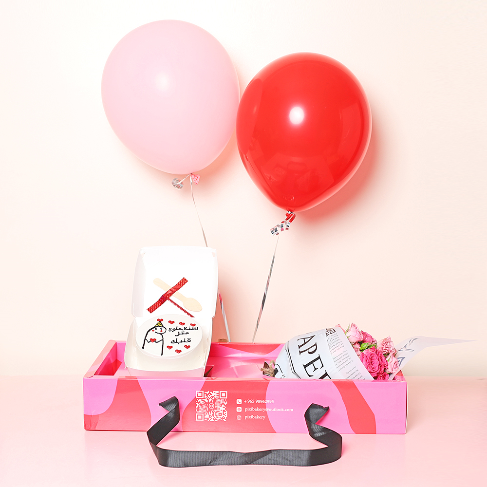 صينية وردية مبهجة تحتوي على كيكة بنتو مع بوكيه زهور صغير ومزينة ببالونات.