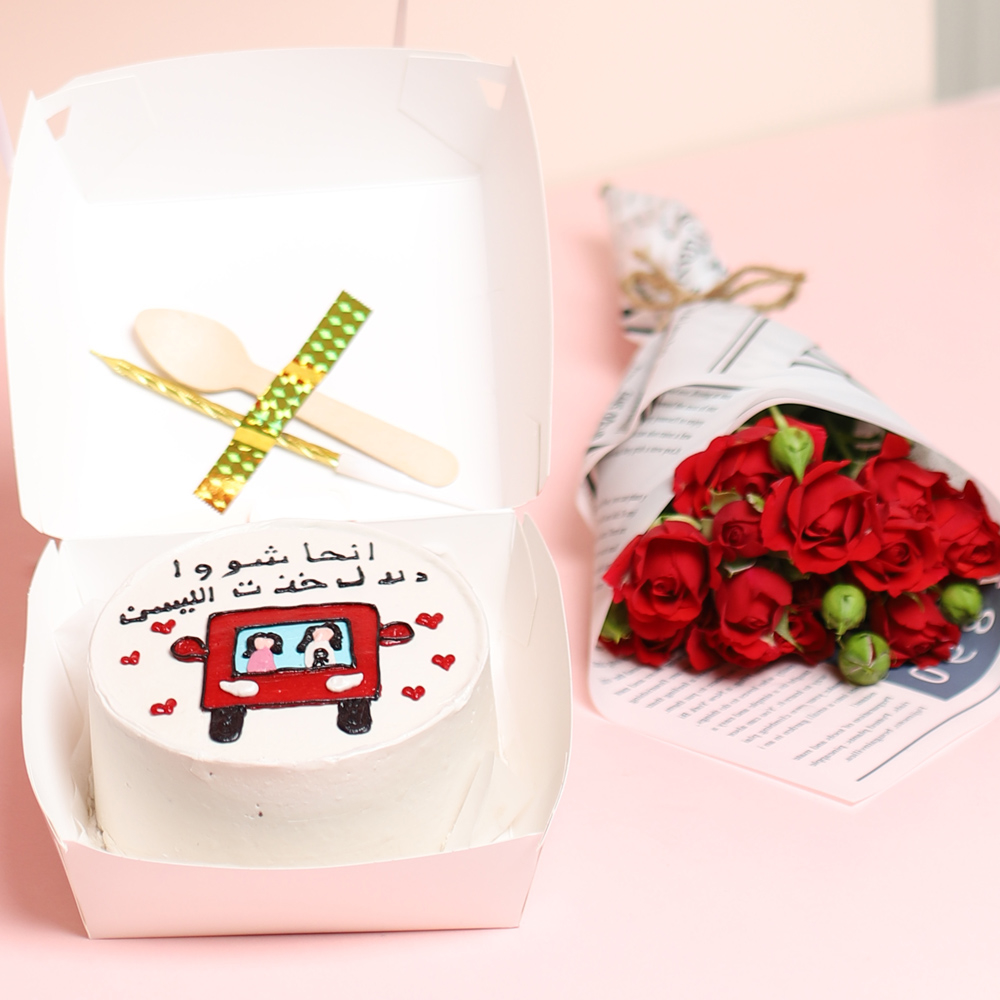 كيكة بينتو بنكهات الشوكولاتة والفانيلا بحجم 4 إنش مع باقة زهور، ملعقة خشبية صغيرة، بالونتين وشمعة.