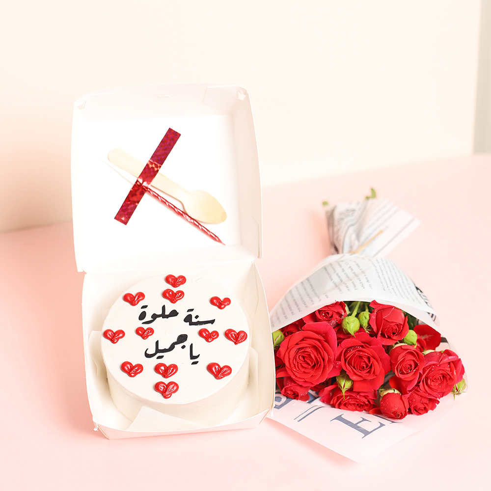 كيكة بنتو مقاس 4 إنش لشخصين مع بوكيه زهور صغير وبالونات وملعقة وشمعة.