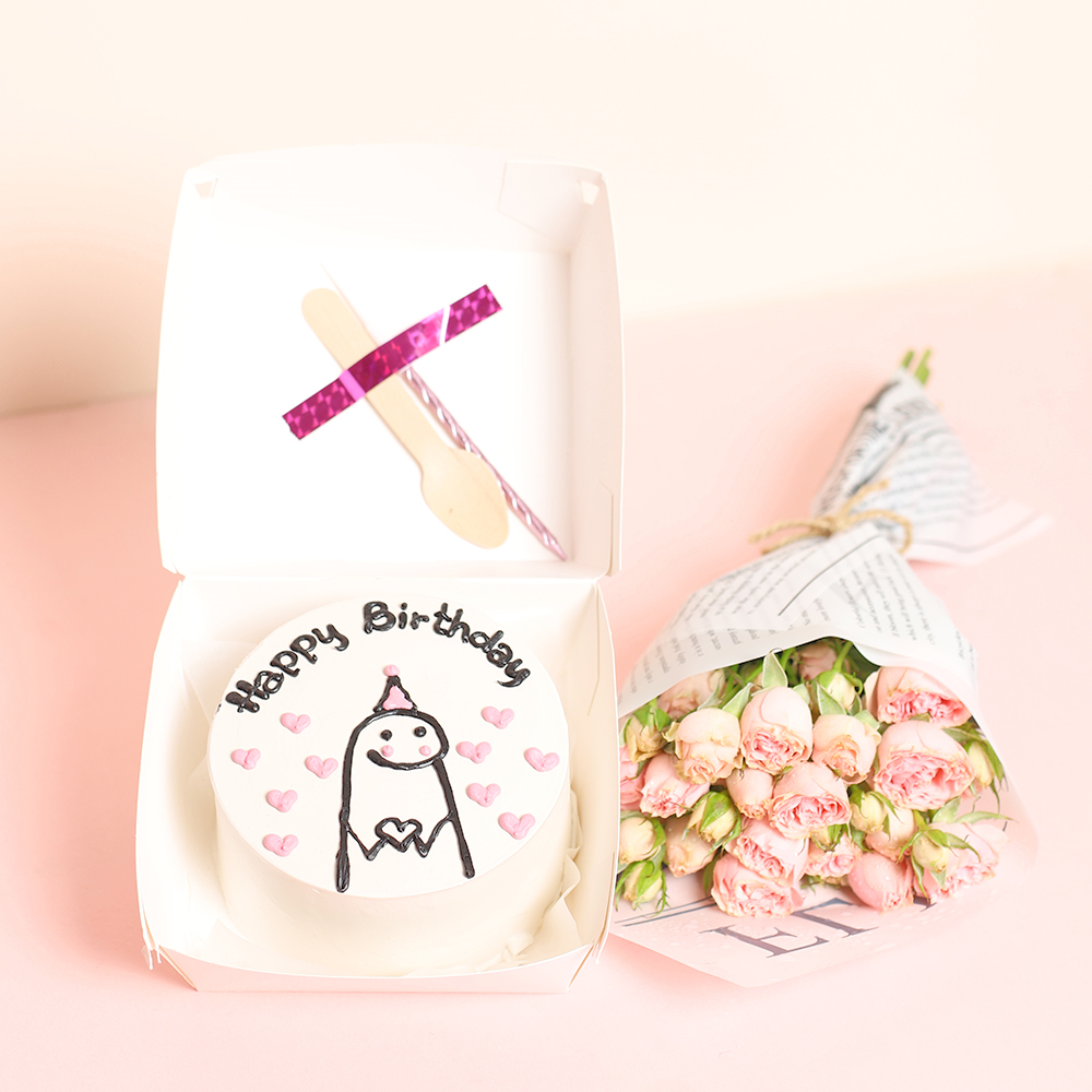 كيكة بنتو مقاس 4 إنش لشخصين مع بوكيه زهور صغير وبالونات وملعقة وشمعة.