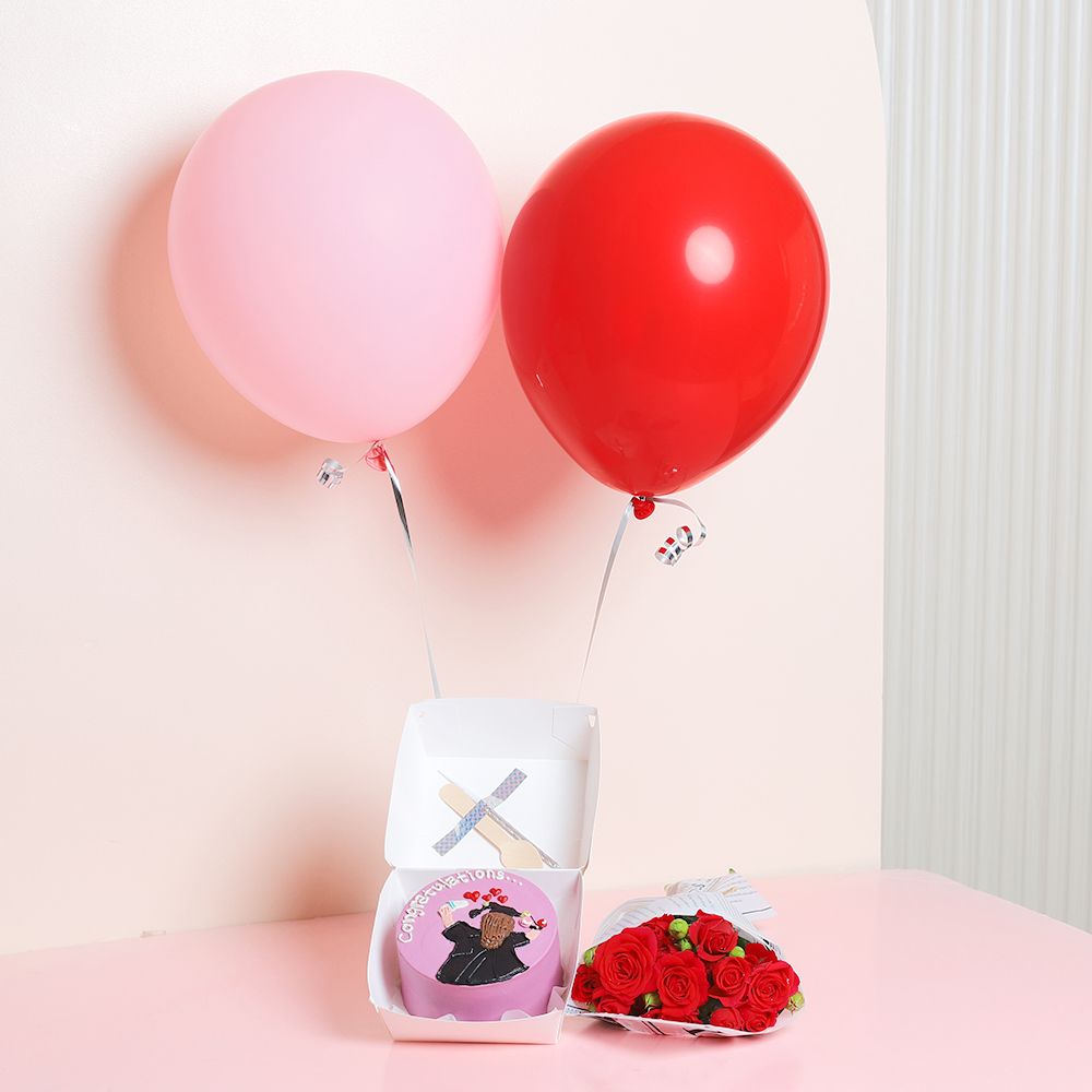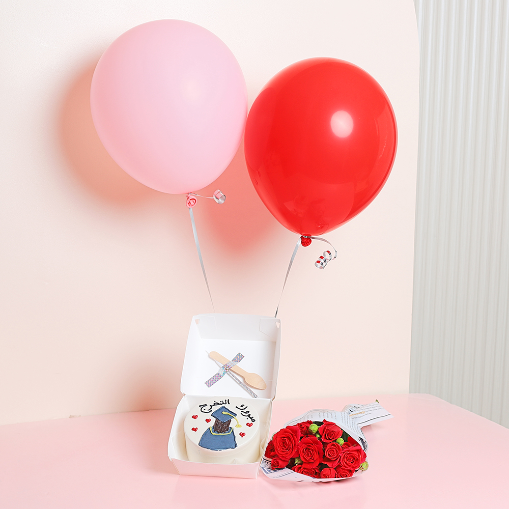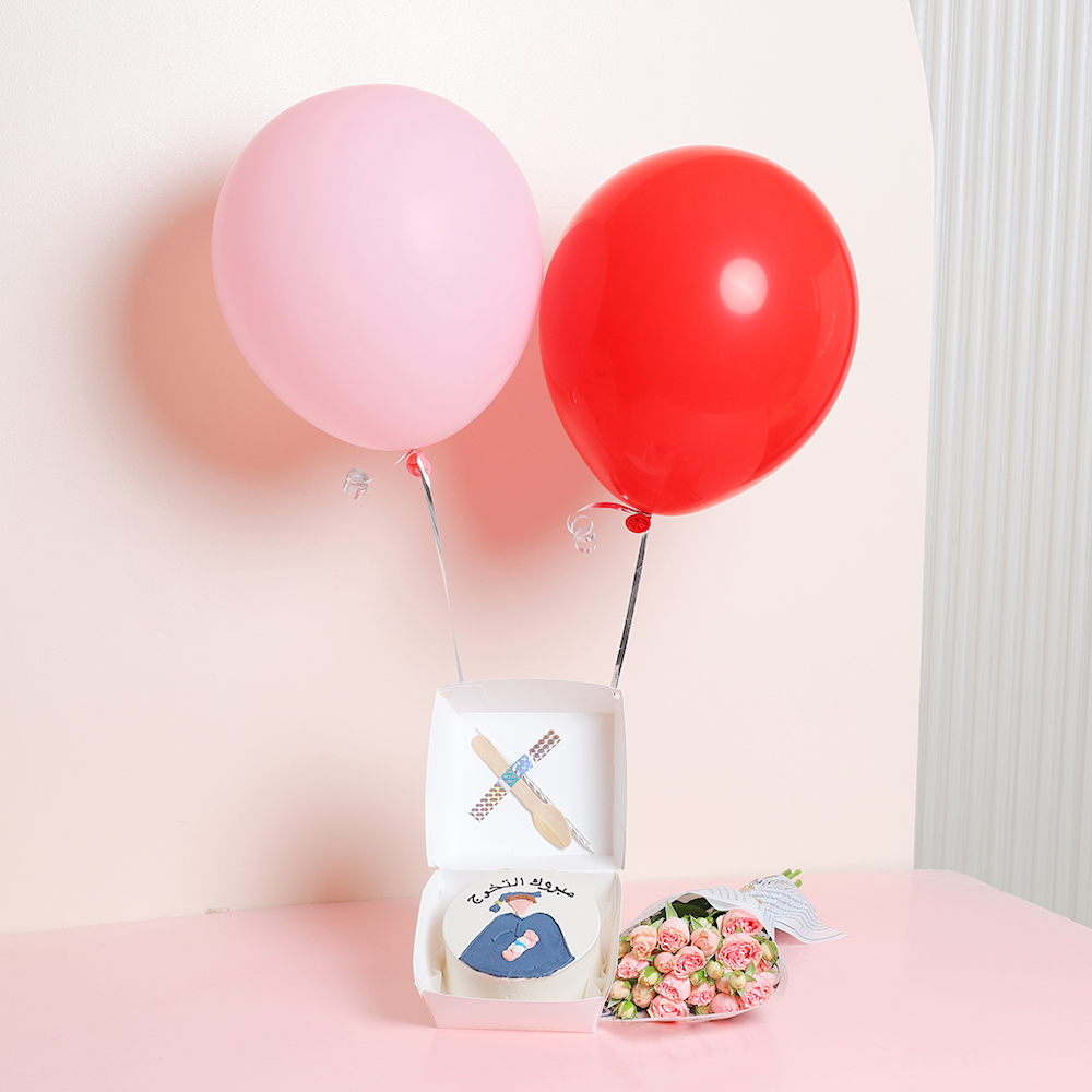 صينية وردية مبهجة تحتوي على كيكة بنتو مع بوكيه زهور صغير ومزينة ببالونات.