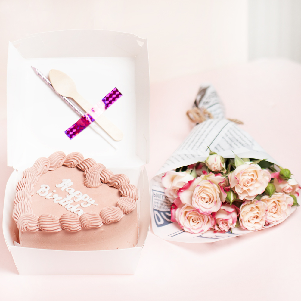 كيكة بنتو مقاس 4 إنش بنكهتي شوكولاتة وفانيلا مع بوكيه زهور وملعقة خشبية صغيرة وبالونين وشمعة.