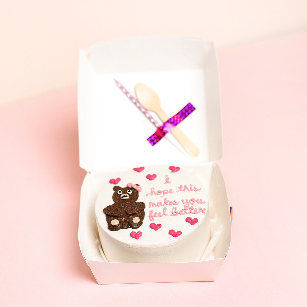 كيكة بنتو مقاس 4 إنش لشخصين مع ملعقة وشمعة مزينة بدبدوب وكلمة "أتمنى أن يجعلك هذا تشعر بتحسن".