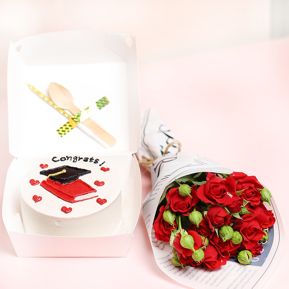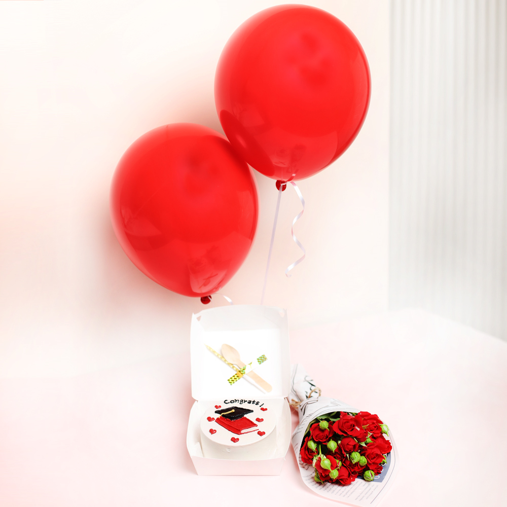 كيكة بنتو مقاس 4 إنش لشخصين مع بوكيه زهور صغير وبالونات وملعقة وشمعة.