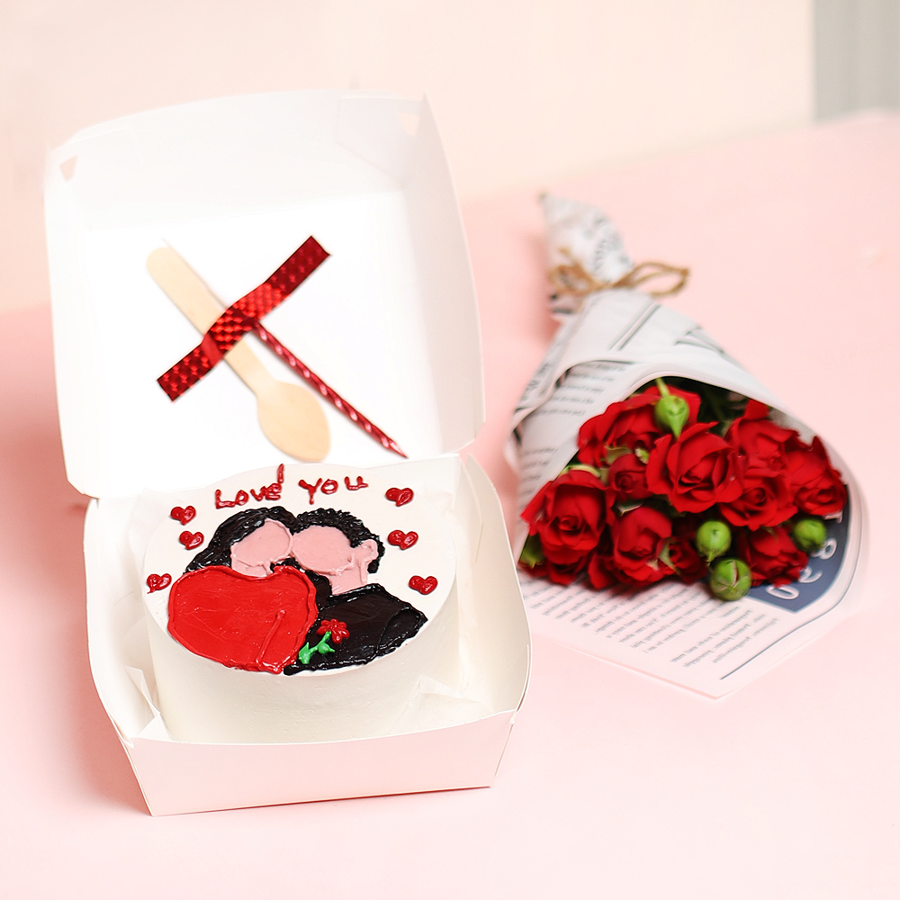 كيكة بينتو بنكهة الفانيلا والشوكولاتة بحجم 4 إنش مع باقة زهور، ملعقة خشبية صغيرة وشمعة.