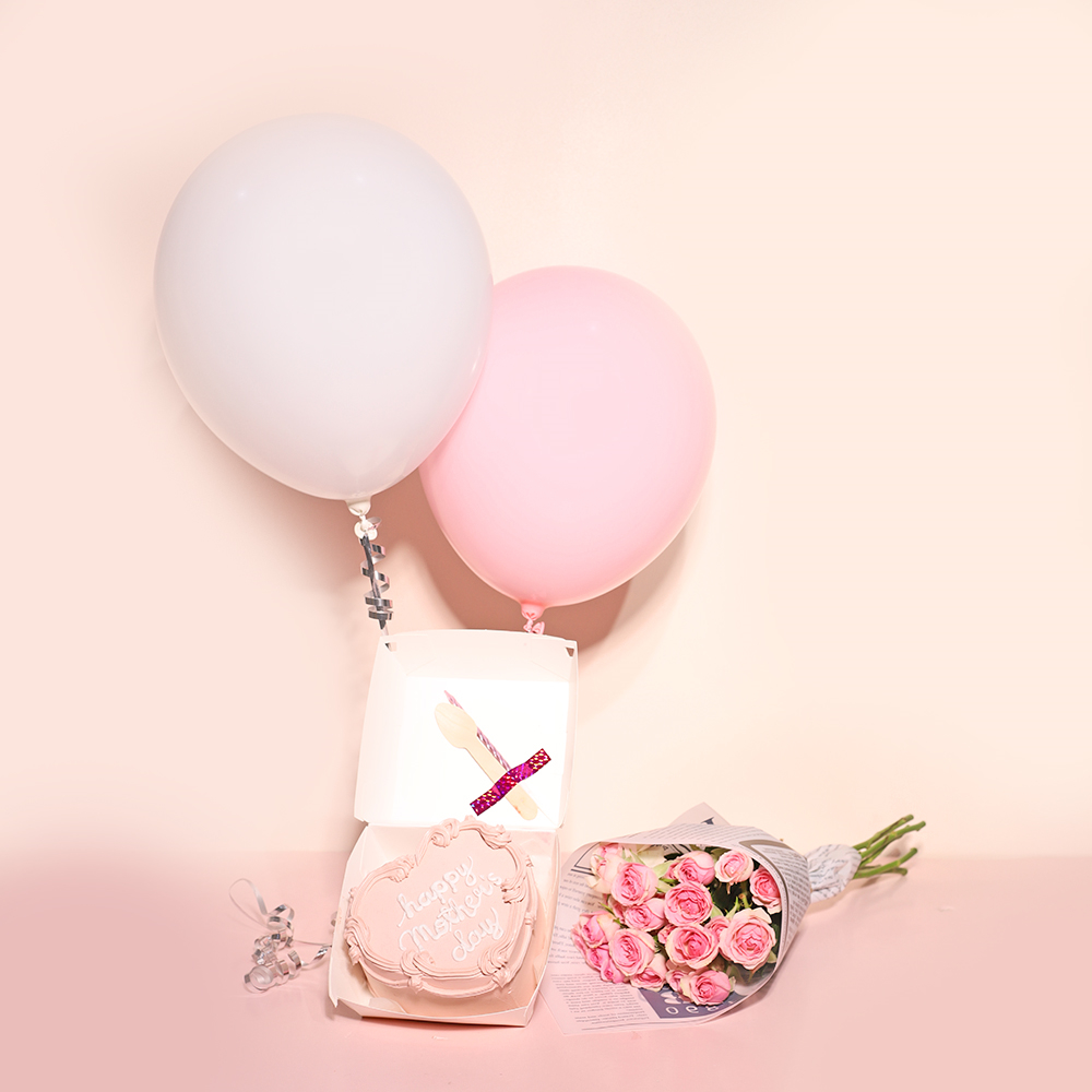كيكة بينتو بحجم 4 انش تكفي لشخصين وتأتي مع ملعقة، شمعة، بالونتين من الهيليوم وباقة أزهار صغيرة.
