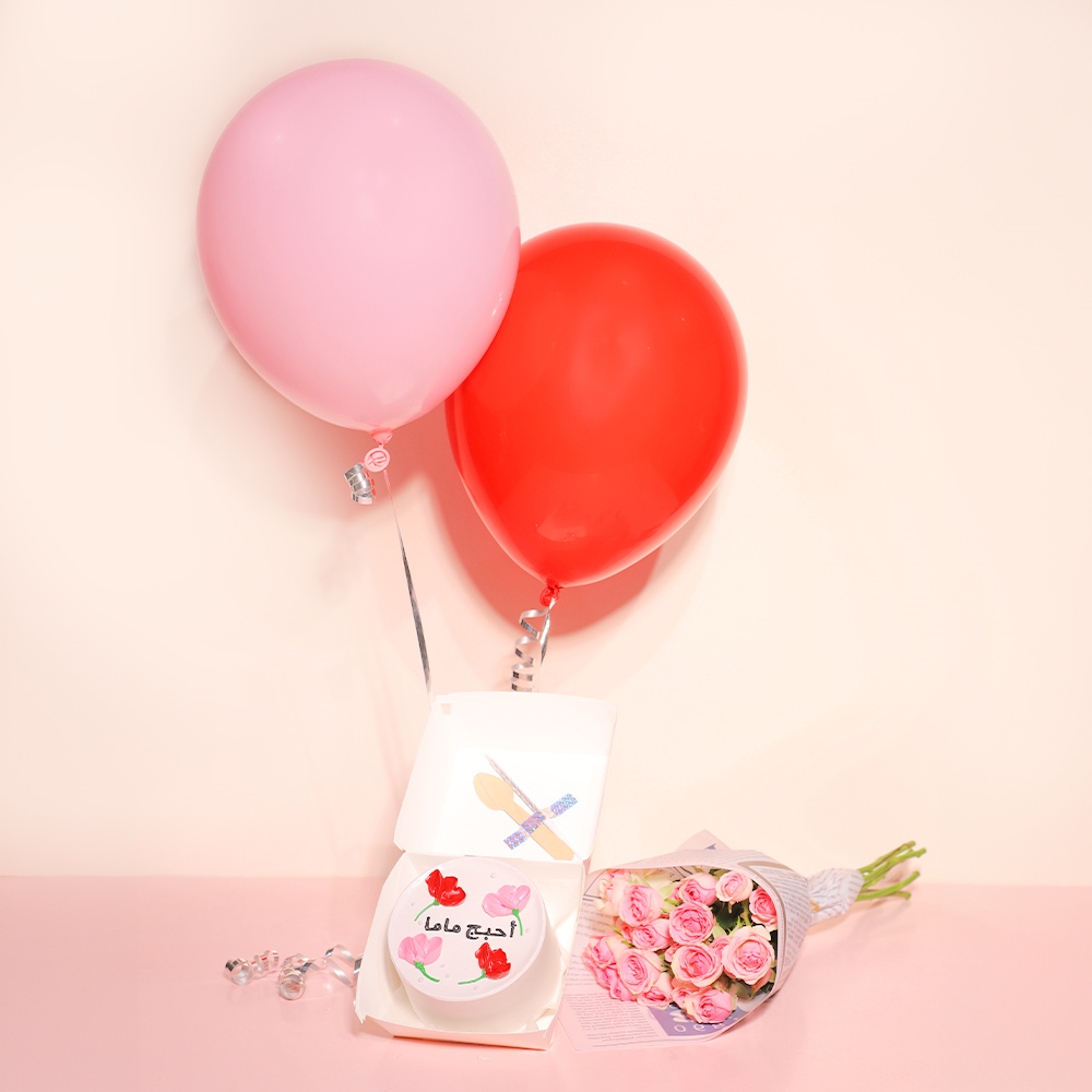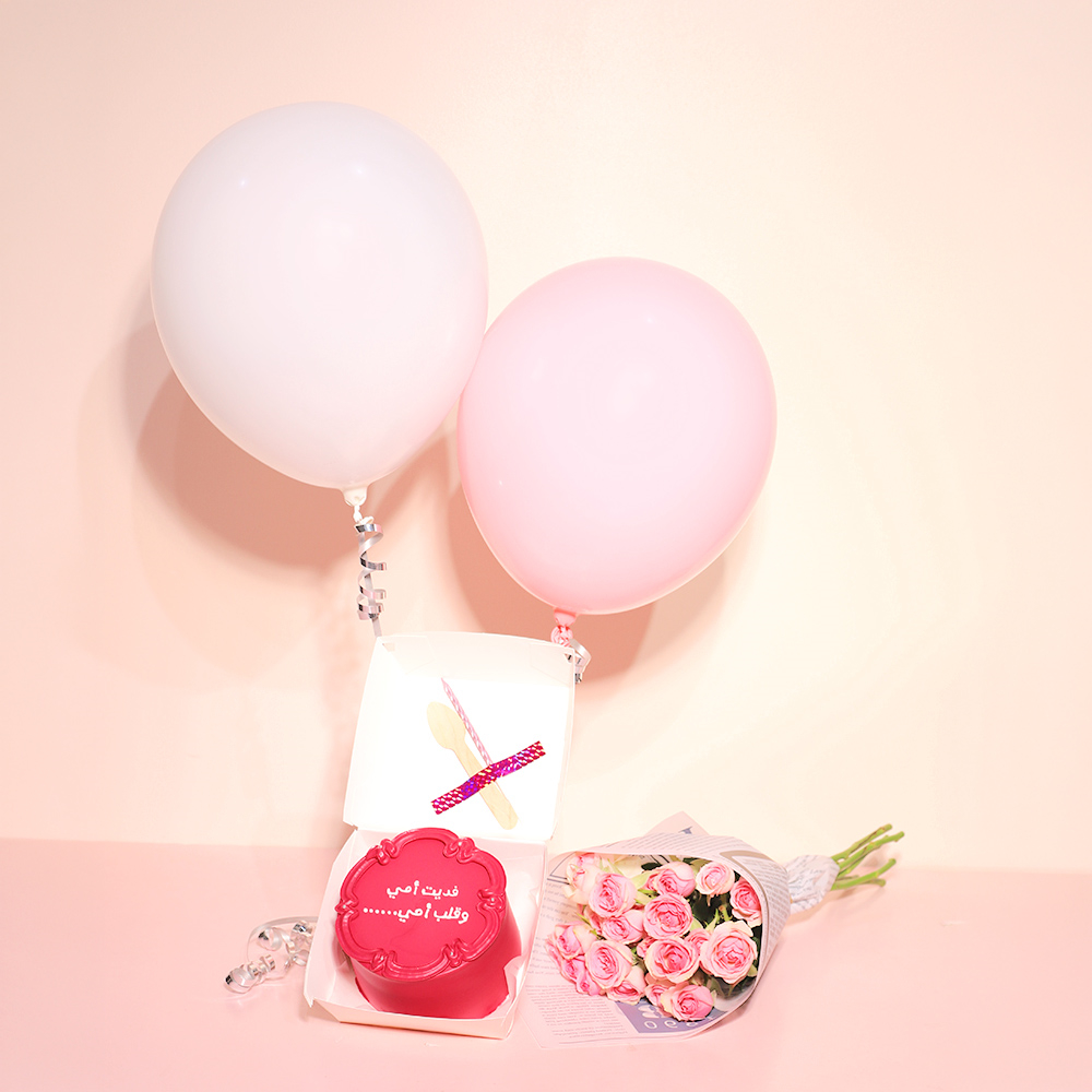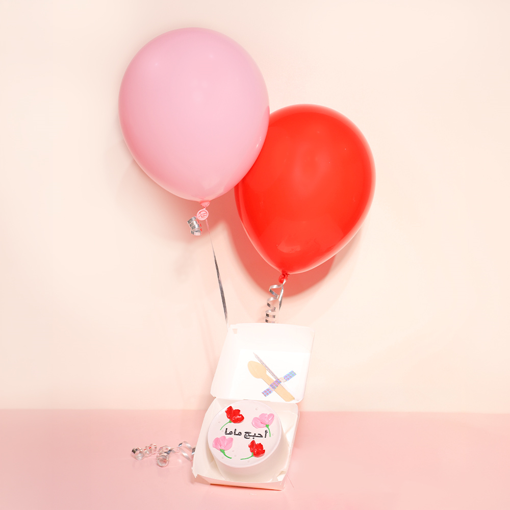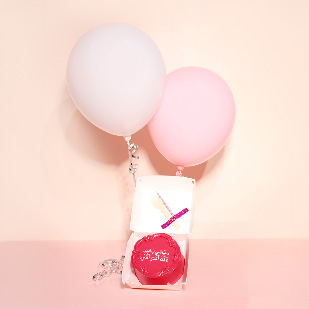 كيكة بينتو بحجم 4 انش تكفي لشخصين وتأتي مع ملعقة، شمعة، بالونتين من الهيليوم وباقة أزهار صغيرة.