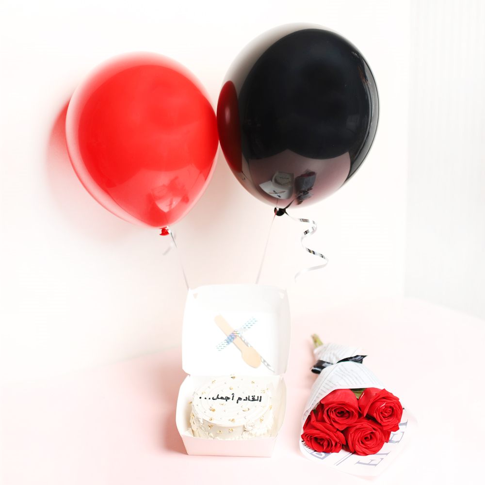 تتميز كيكة بينتو السنة الجديدة الرائعة بباقة من زهور الجوري الحمراء وبالونين بتصميم بسيط. تأتي الكيكة في علبة غداء كلاسيكية صديقة للبيئة، وتتضمن ملعقة خشبية وشمعة. نكهة الكيكة هي الشوكولاتة أو الفانيلا.