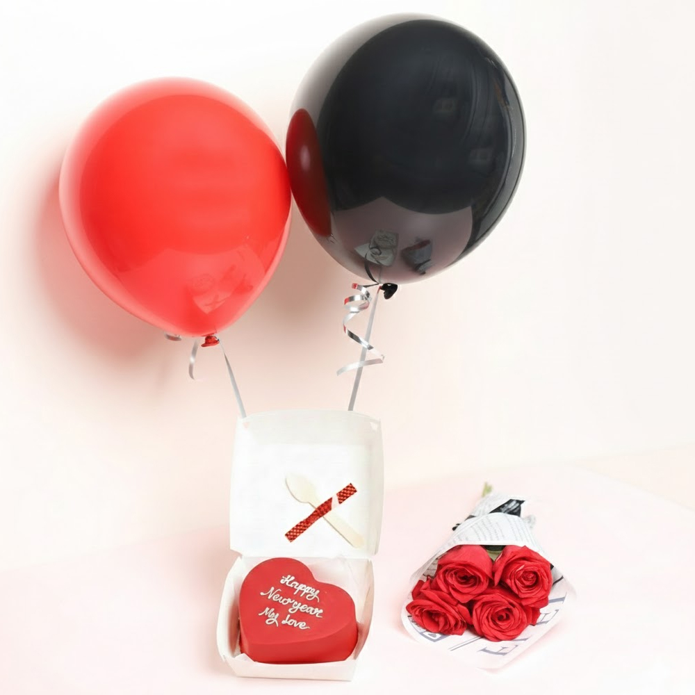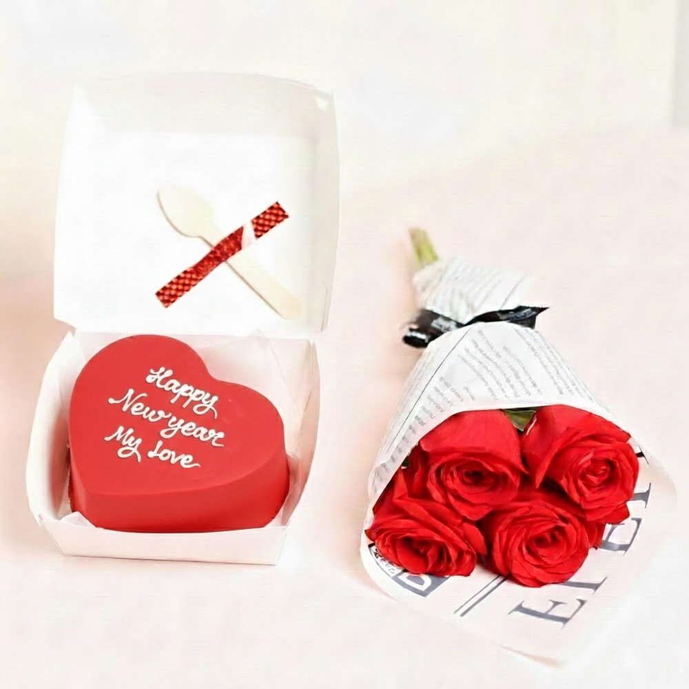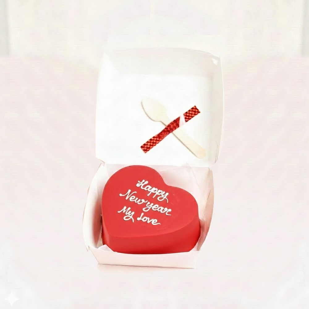كيكة بينتو للعام الجديد مزين بباقة زهور جوري حمراء وبالونتين بأسلوب بسيط، معبأ في علبة غداء كلاسيكية صديقة للبيئة، مع ملعقة خشبية وشمعة مرفقة.
