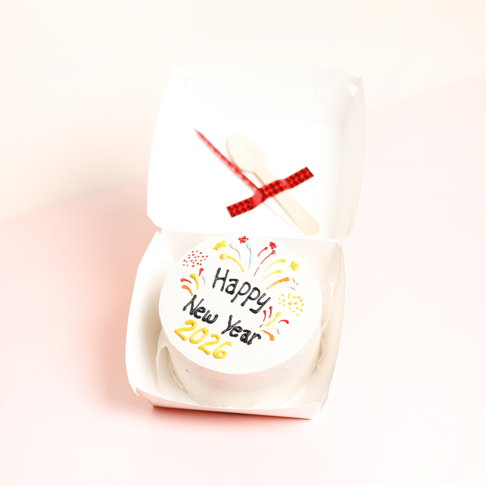 كيكة بينتو لراس السنة بتصميم بسيط، تأتي في بوكس غداء كلاسيكي صديق للبيئة مع ملعقة خشبية وشمعة مرفقة، مع كتابة سنة جديدة سعيدة.