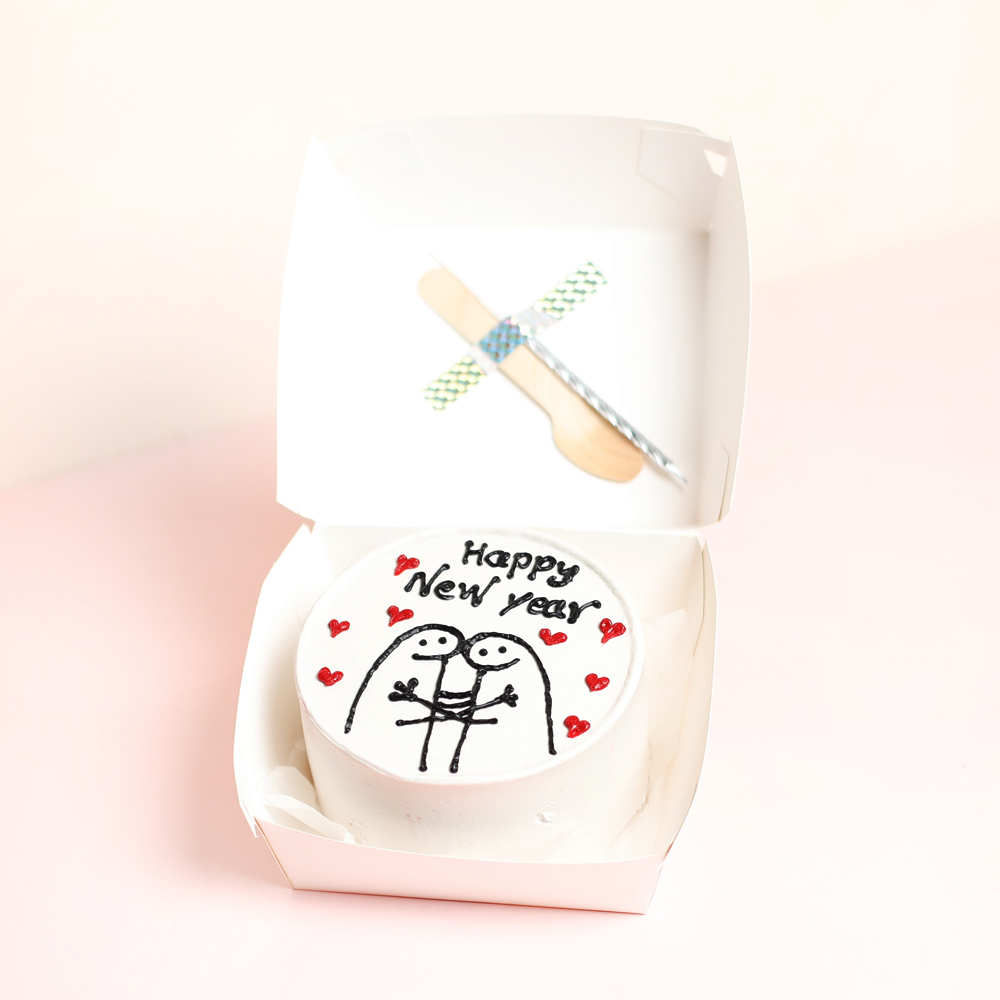 كيكة بينتو لراس السنة بتصميم بسيط، تأتي في بوكس غداء كلاسيكي صديق للبيئة مع ملعقة خشبية وشمعة مرفقة، مع كتابة سنة جديدة سعيدة.