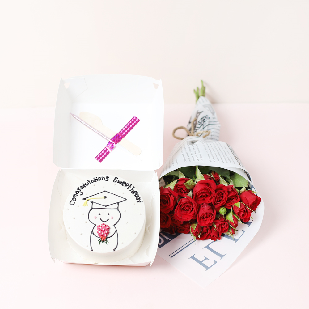 كيكة بينتو مستديرة الشكل مزينة بباقة صغيرة من الورود الحمراء بتصميم بسيط. معبأة في علبة غداء كلاسيكية صديقة للبيئة، وتتضمن ملعقة خشبية وشمعة.