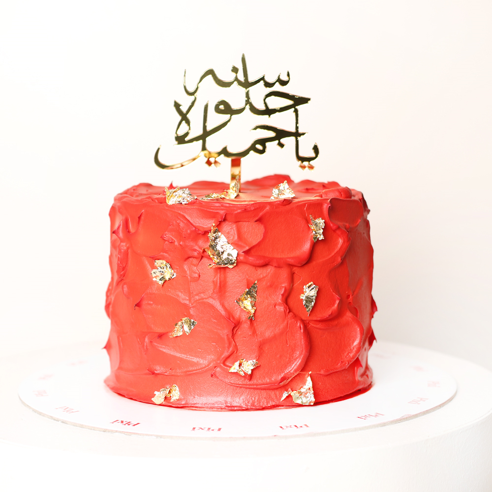 أضف لمسة مميزة إلى احتفالك مع هذه الكيكة الحمراء النابضة بالحياة بحجم 6 بوصات، مُزينة بكريمة زبدة غنية وذات قوام مميز، ومُزينة برقائق ذهبية فاخرة. إنها الهدية المثالية الجريئة لأي احتفال بعيد ميلاد.