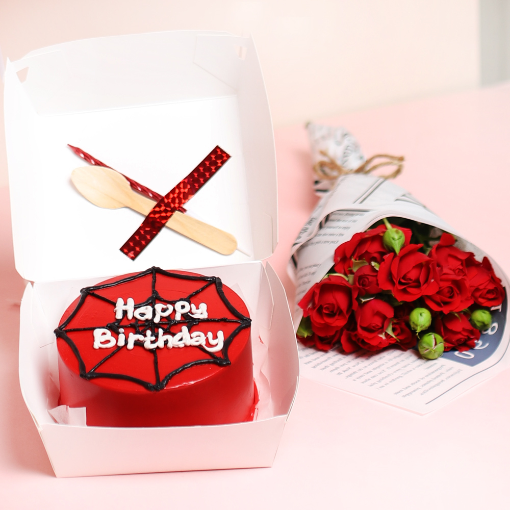 كيكة بينتو بنكهات الشوكولاتة والفانيلا بحجم 4 إنش مع باقة زهور، ملعقة خشبية صغيرة، بالونتين وشمعة.