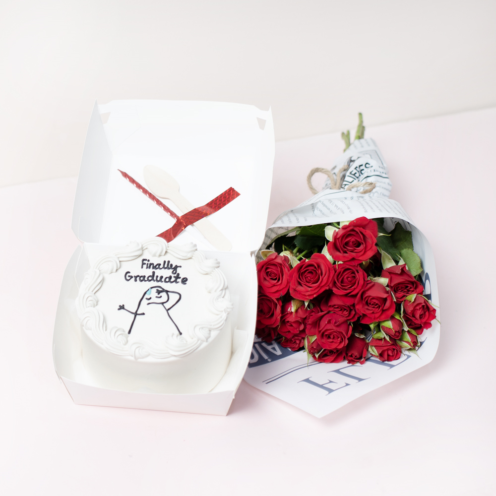 كيكة بينتو مستديرة الشكل مزينة بباقة صغيرة من الورود الحمراء بتصميم بسيط. معبأة في علبة غداء كلاسيكية صديقة للبيئة، وتتضمن ملعقة خشبية وشمعة.