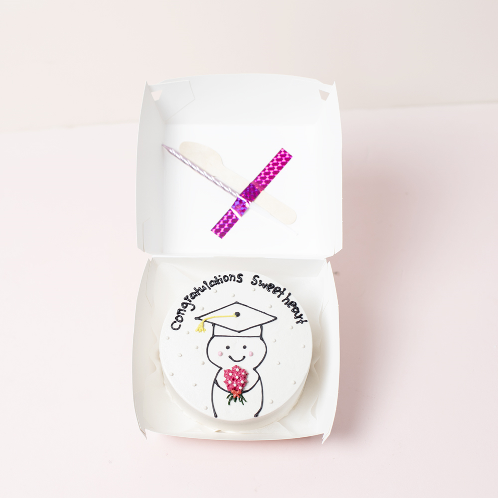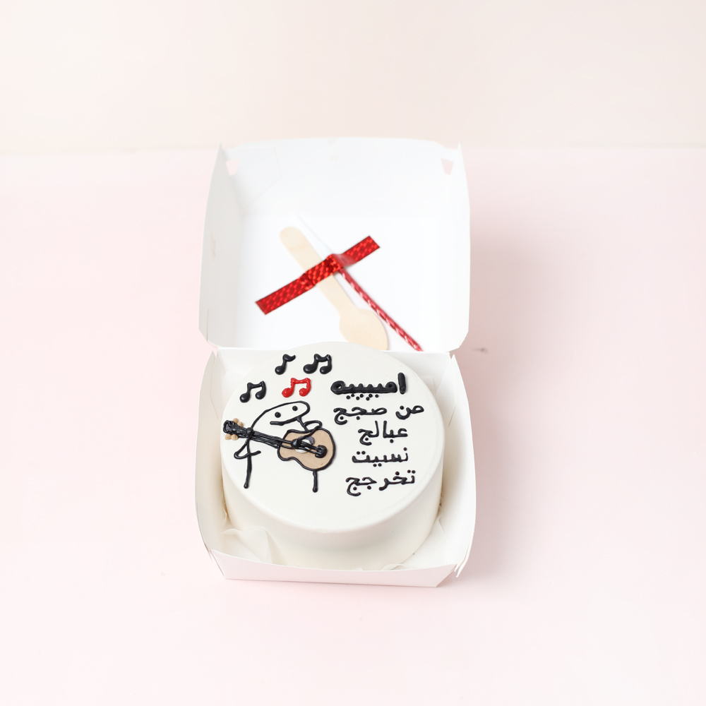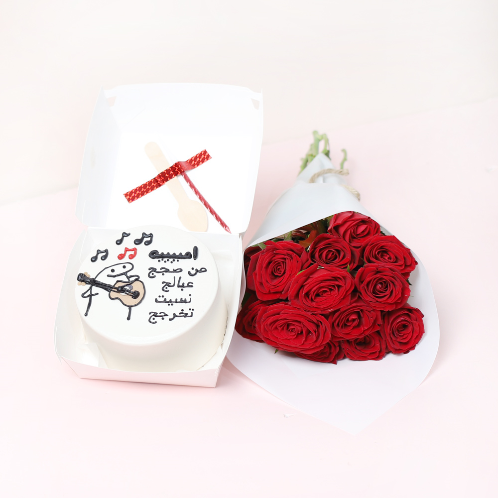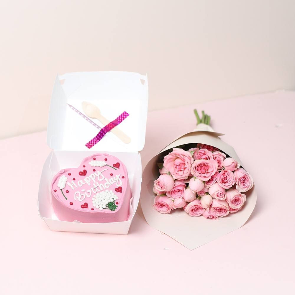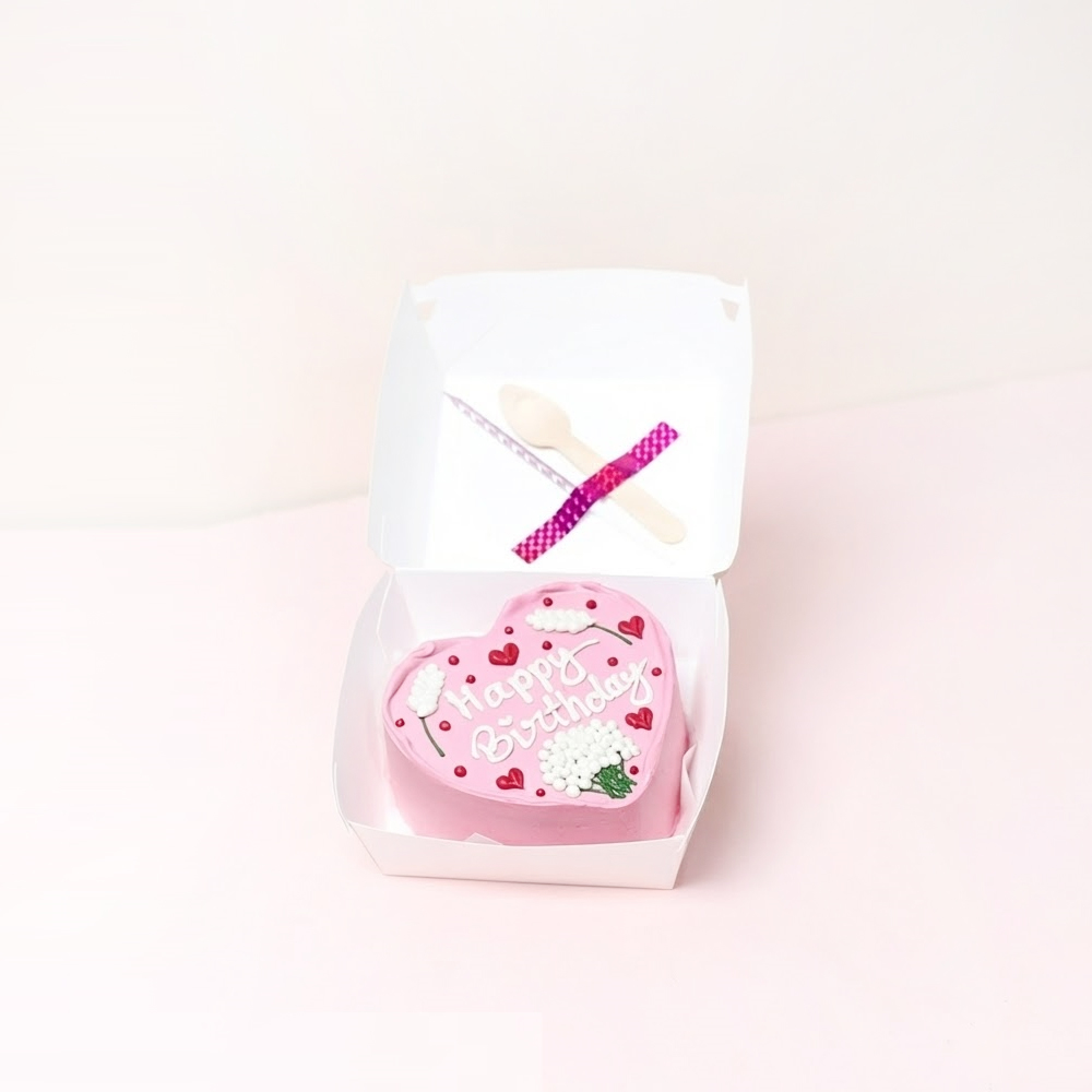 كيكة بينتو حمراء على شكل القلب مع باقة يد صغيرة من الجوري الأحمر بتصميم بسيط. تأتي الكيكة في علبة غداء كلاسيكية صديقة للبيئة، وتتضمن ملعقة خشبية وشمعة.