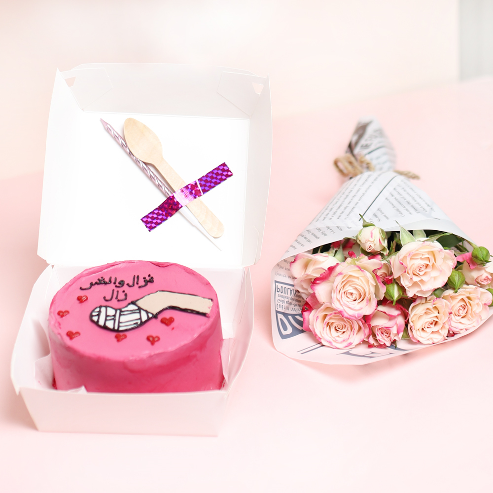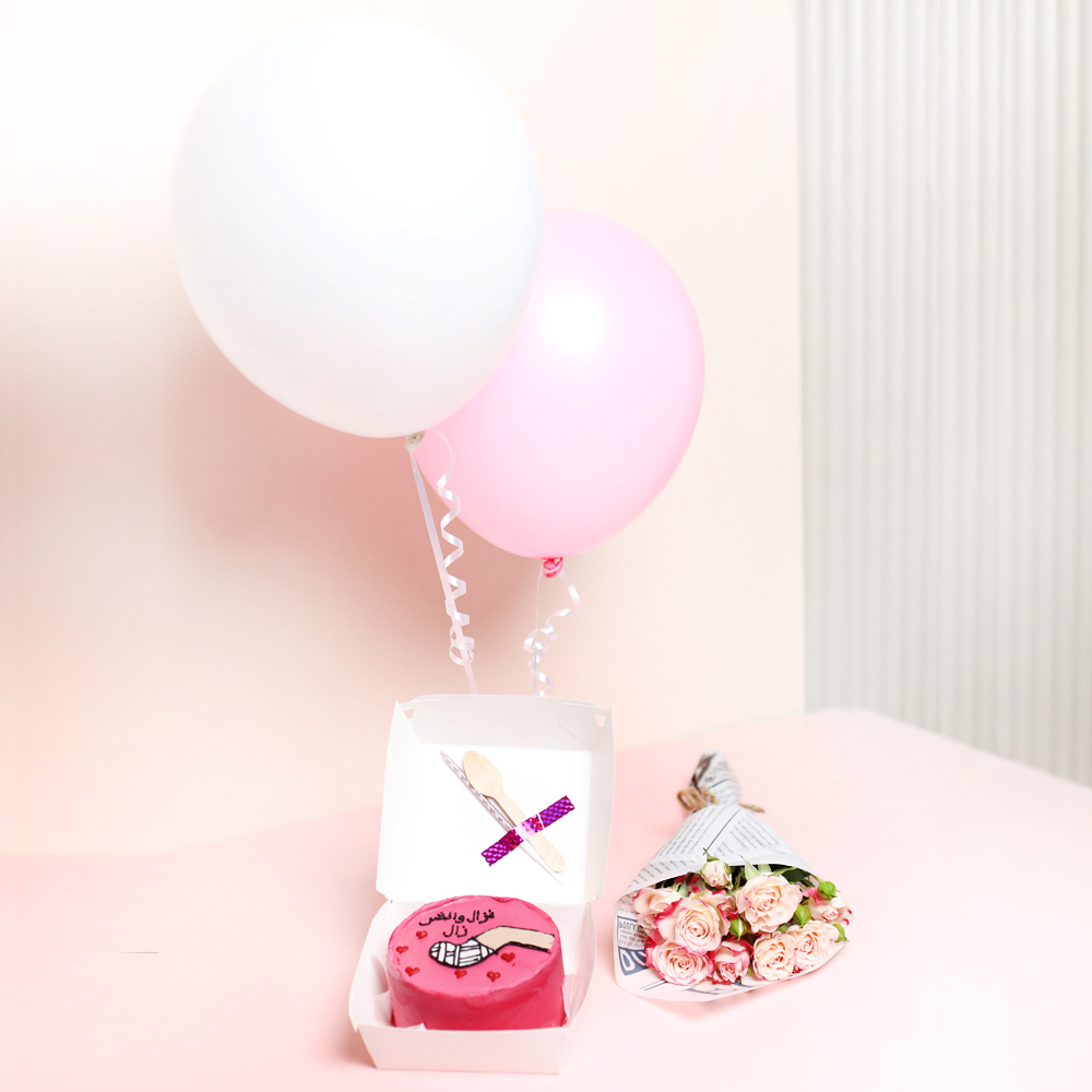 كيكة بنتو مقاس 4 إنش لشخصين مع بوكيه زهور صغير وبالونات وملعقة وشمعة.