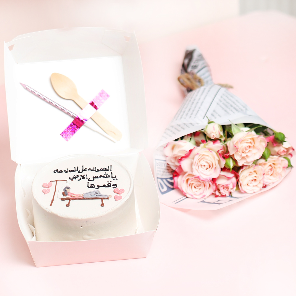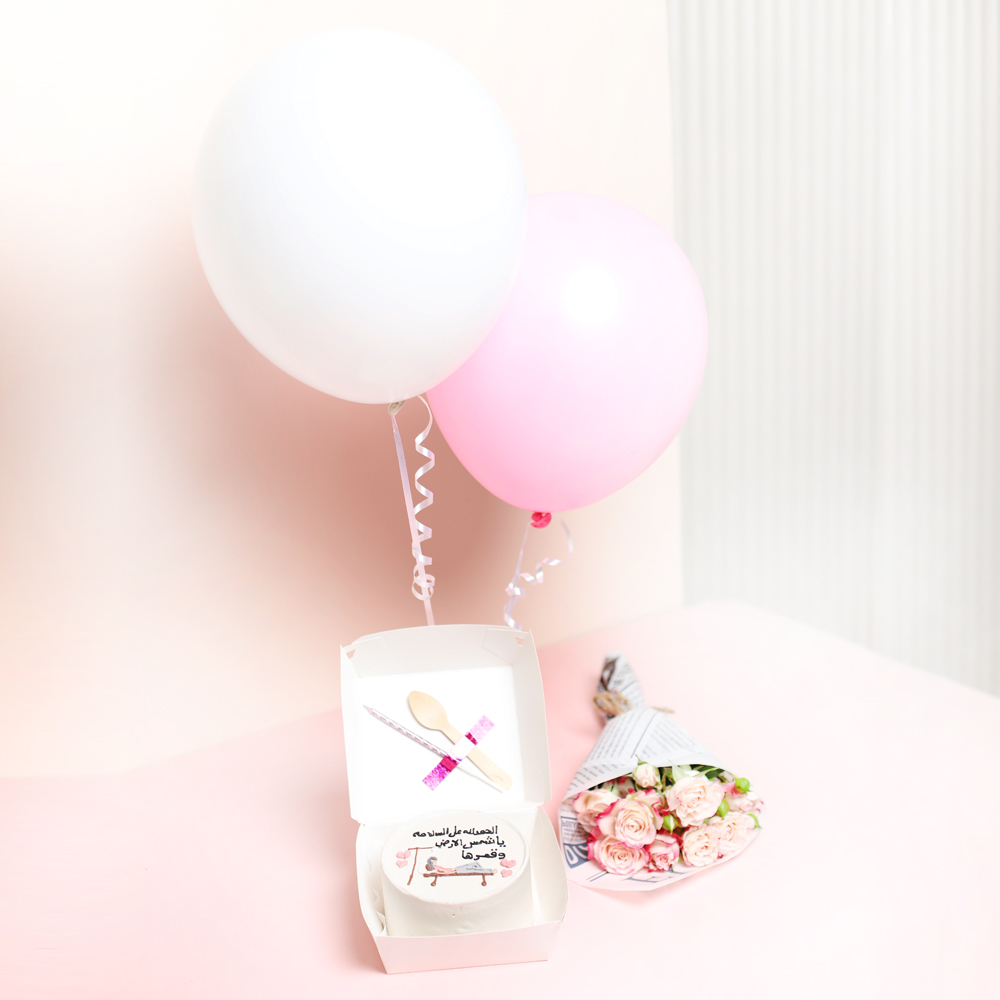 كيكة بنتو مقاس 4 إنش لشخصين مع بوكيه زهور صغير وبالونات وملعقة وشمعة.