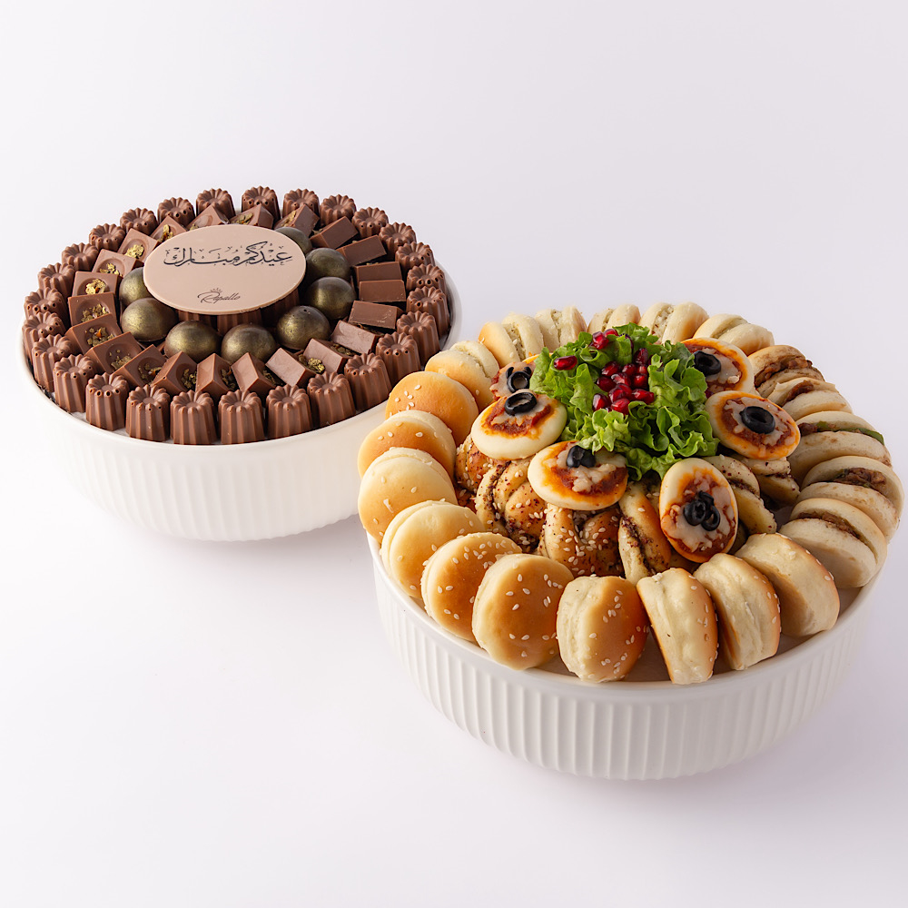 صينية متنوعة من حلويات العيد التقليدية، تضم شوكولاتة لذيذة وفطائر مميزة، محضرة بمكونات عالية الجودة لتناسب احتفالات العيد.