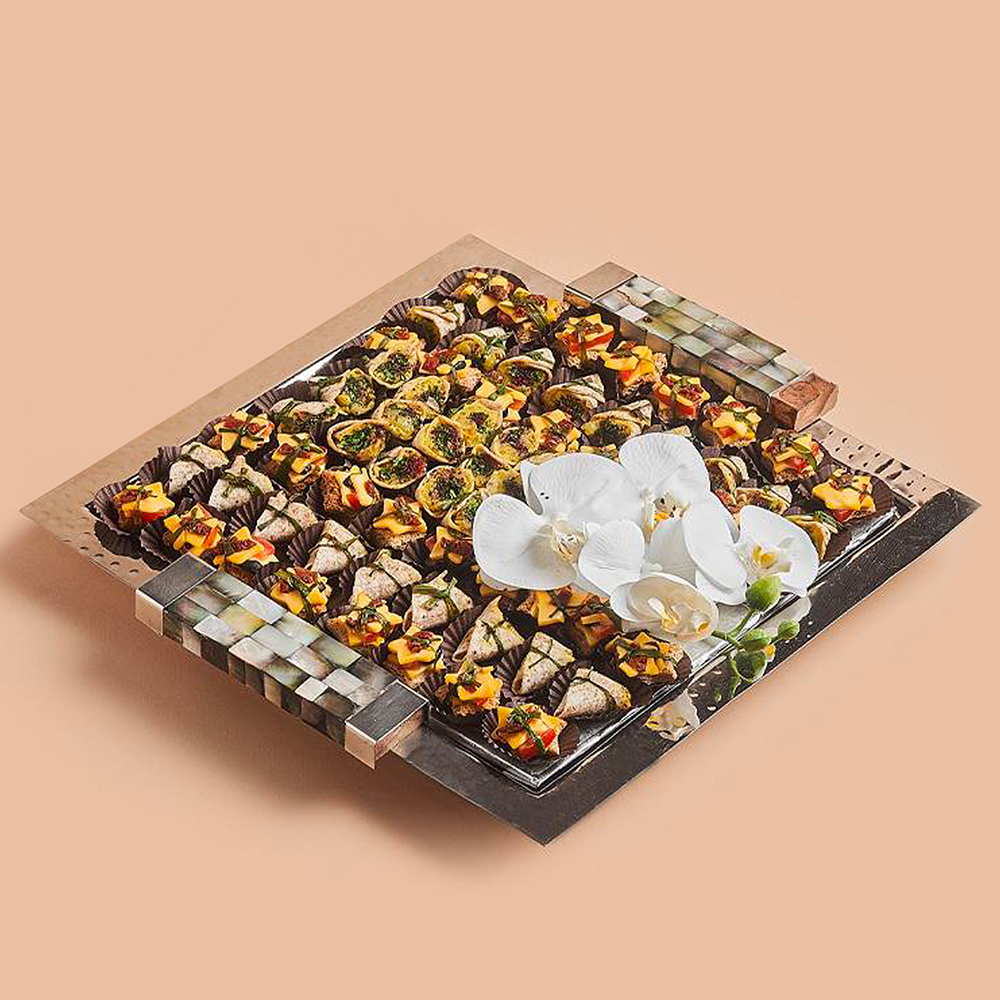تشكيلة رائعة من المأكولات الشهية مُرتبة بشكل جميل على صينية احتفالية. مثالية للاحتفالات والتجمعات مع العائلة والأصدقاء. تتضمن مجموعة متنوعة من اللقيمات اللذيذة التي ستنال إعجاب الجميع.