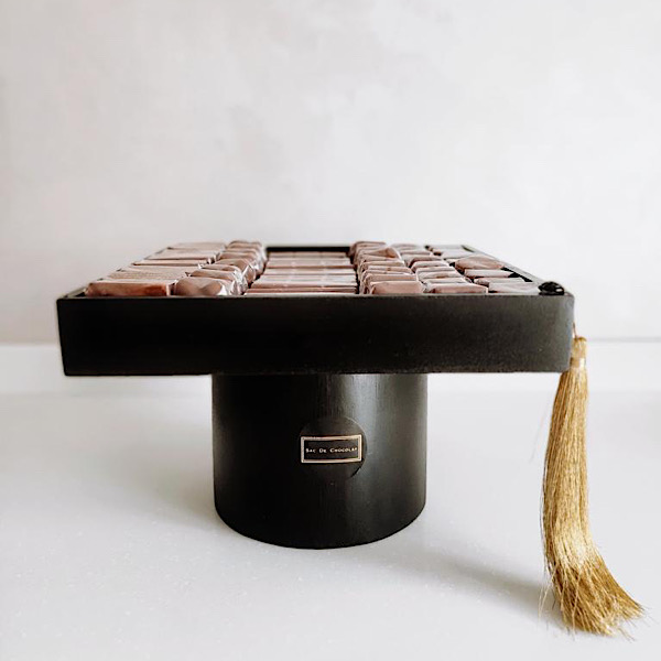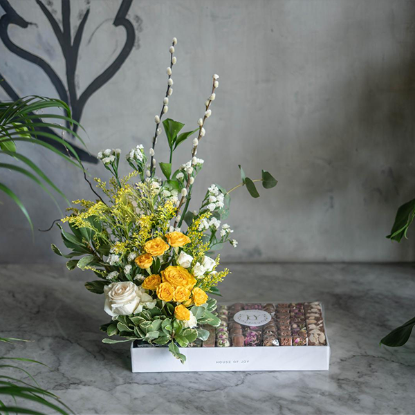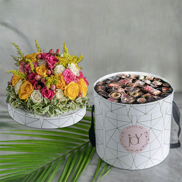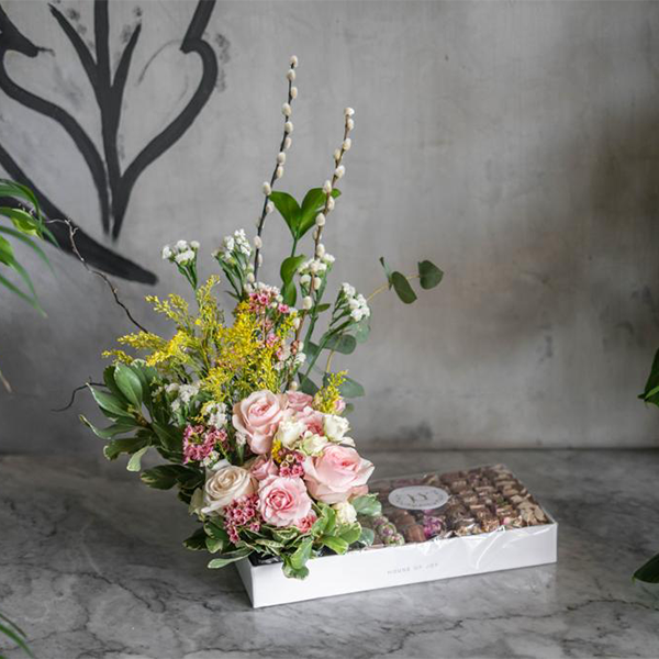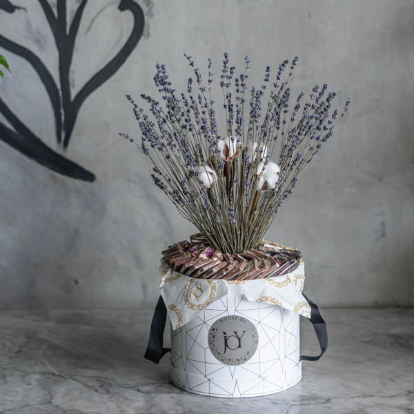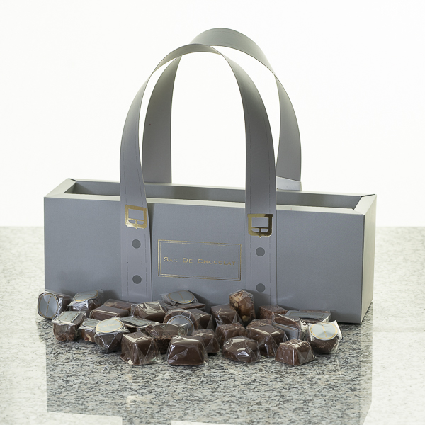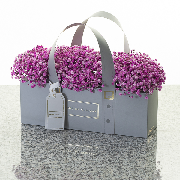 حقيبة كلاسيكية مع نصف كيلو شوكولاتة مشكلة مع زهور جبسوفيلا.