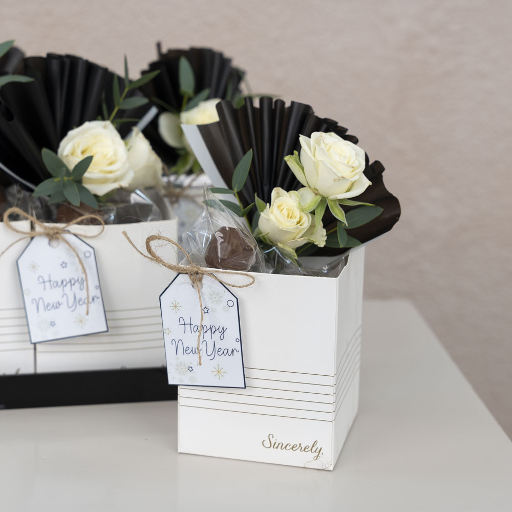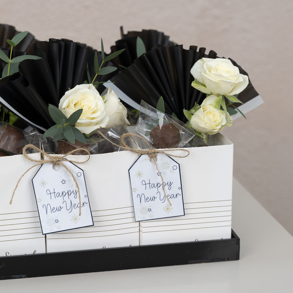 صينية الاكريلك تحتوي على 10 علب كل علبة تحتوي على حفنة من الشوكولاتة البلجيكية متعددة الحشوات مزينه بزهور البيبي روز.