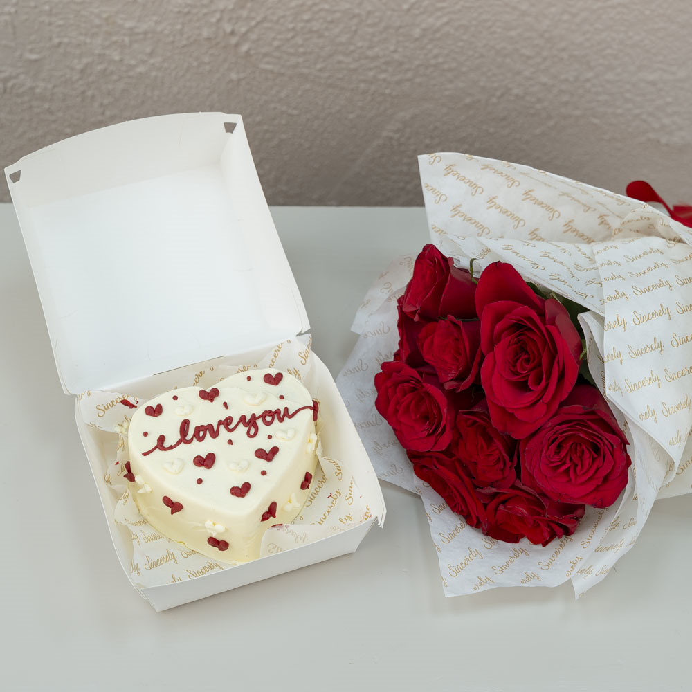 كيكة لذيذة بحجم 4 بوصات بنكهه الشوكولاتة لشخصين، مع باقة زهور متوسطة الحجم تتكون من الجوري.