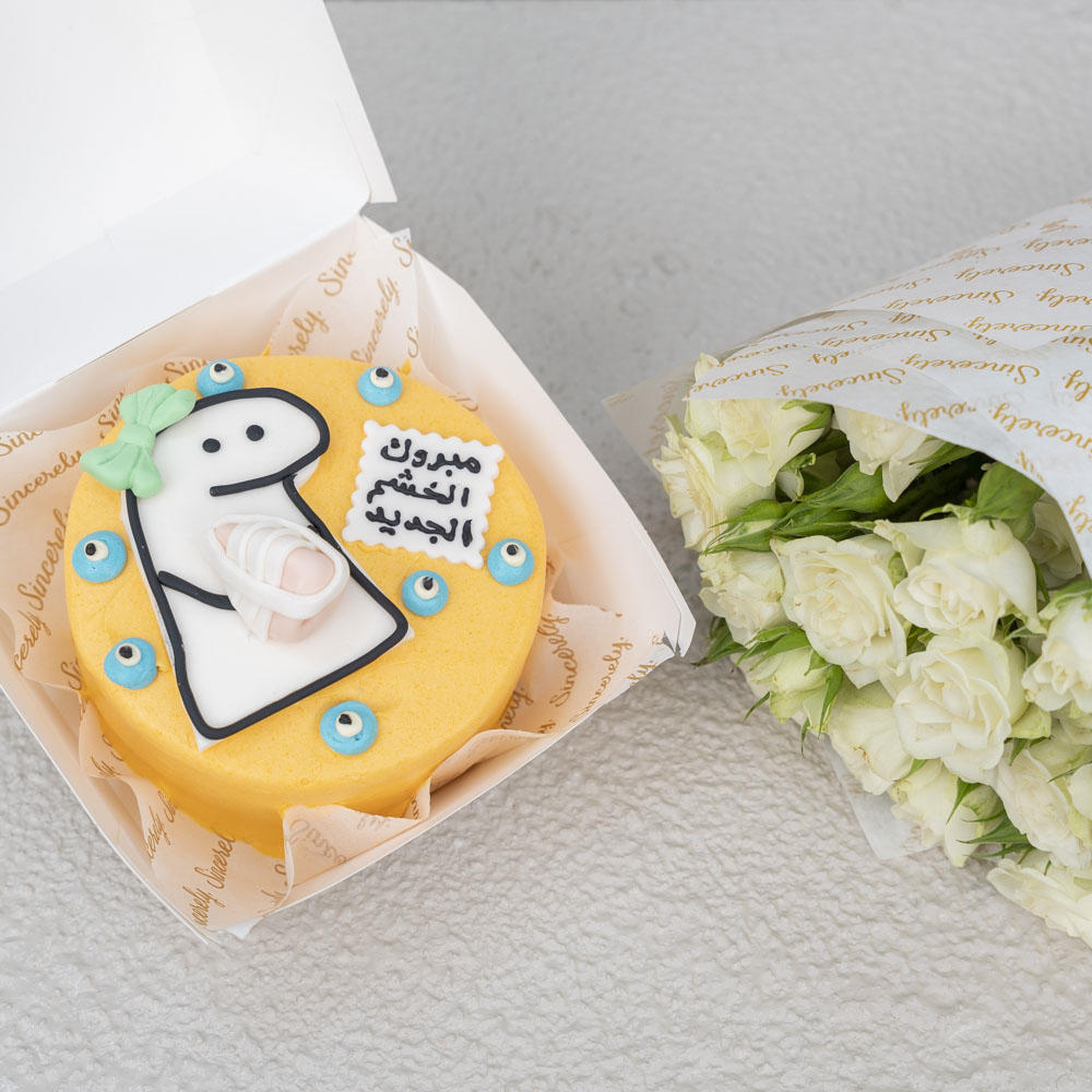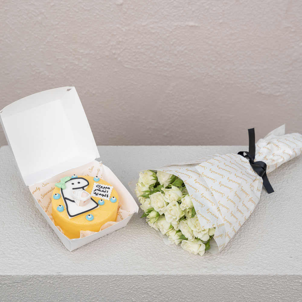كيكة لانش بوكس لذيذة بحجم 4 بوصات بنكهه الشوكولاتة لشخصين، تقدم في علبة كرتونية مع باقة صغيرة من البيبي روز.