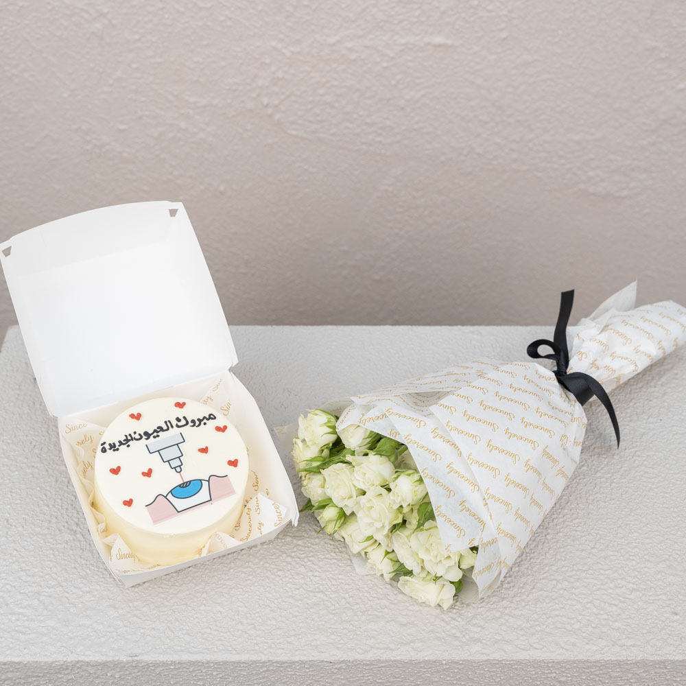 كيكة لانش بوكس لذيذة بحجم 4 بوصات بنكهه الشوكولاتة لشخصين، تقدم في علبة كرتونية مع باقة صغيرة من البيبي روز.