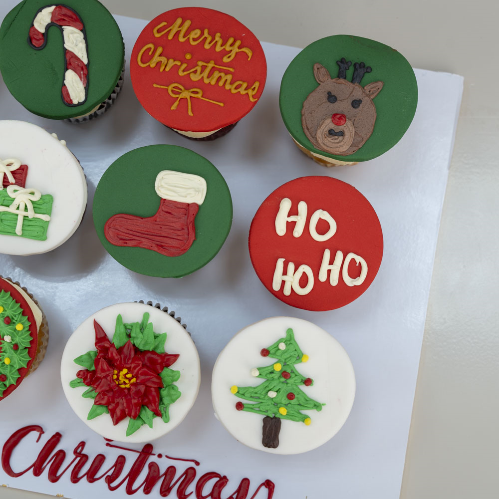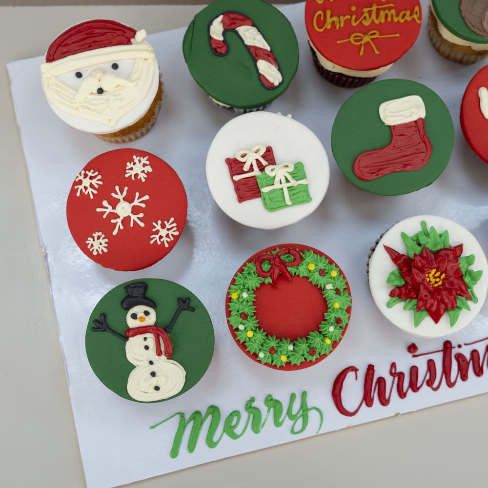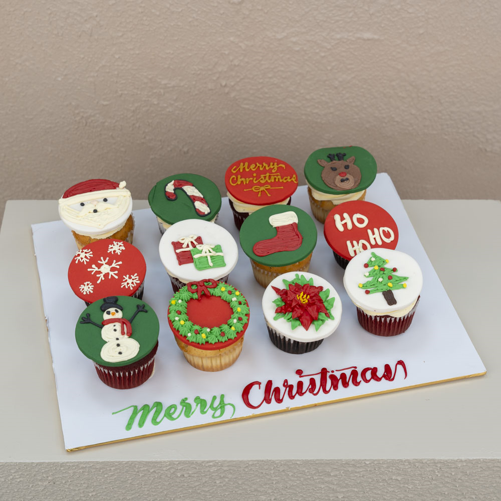 12 قطعة من الكب كيك بنكهات مختلفة، الشوكولاتة والفانيليا والريد فيلفيت.
