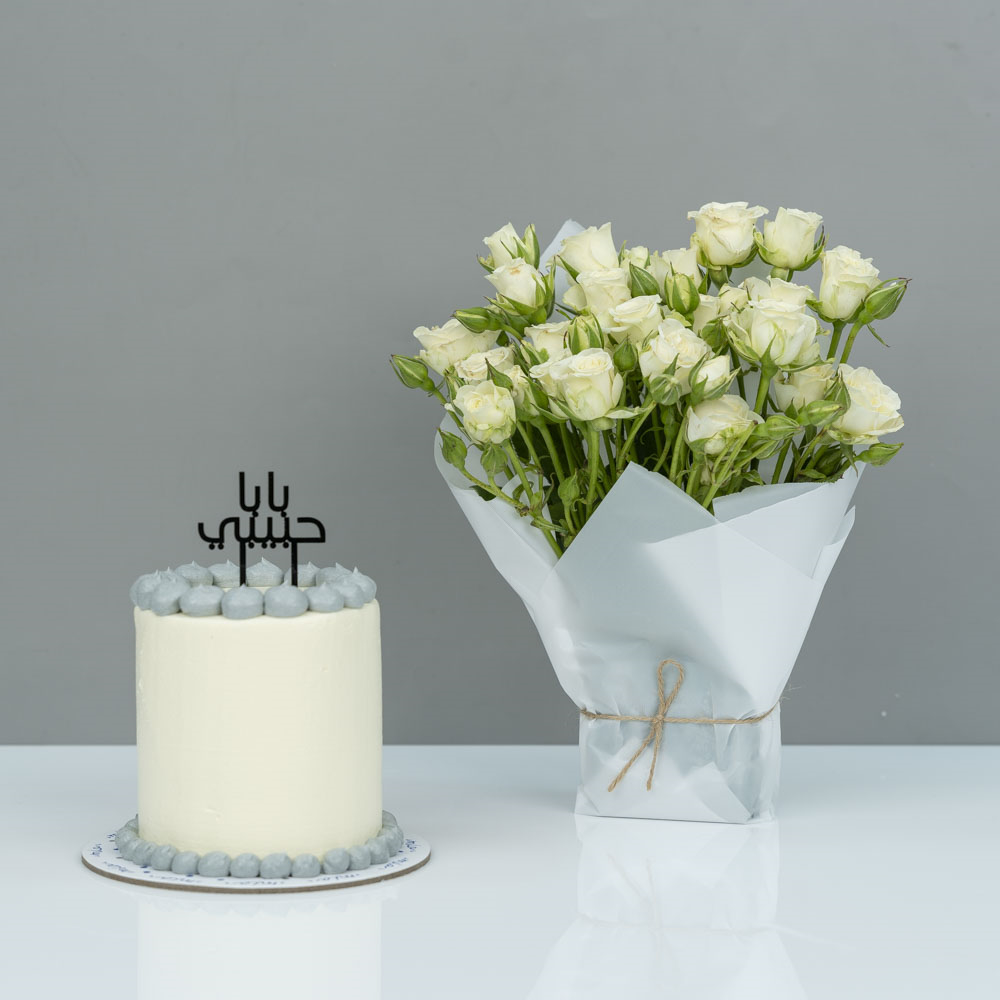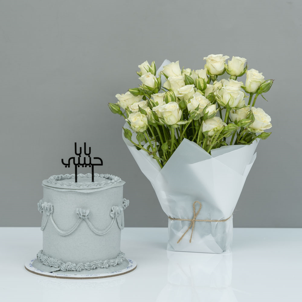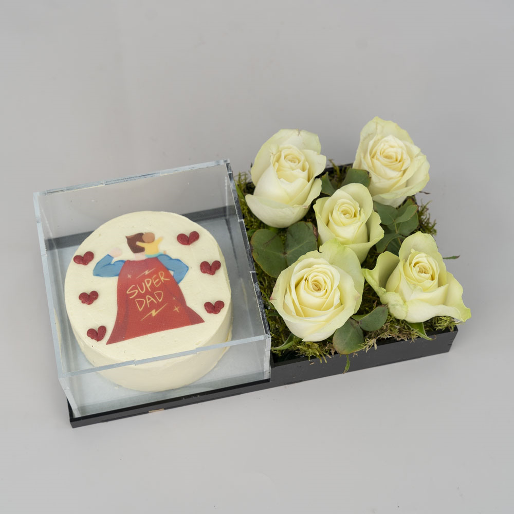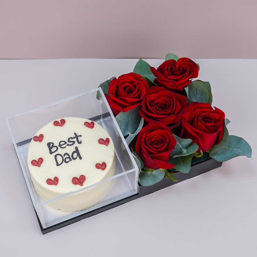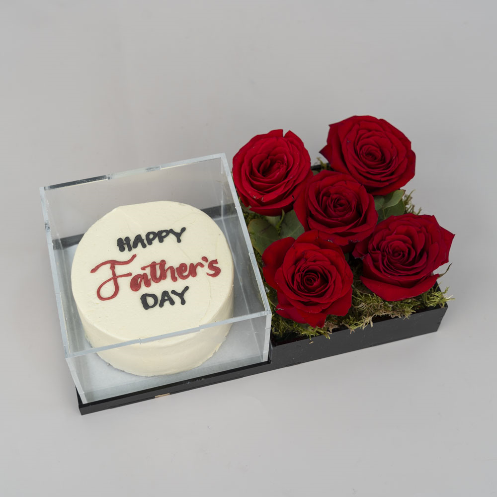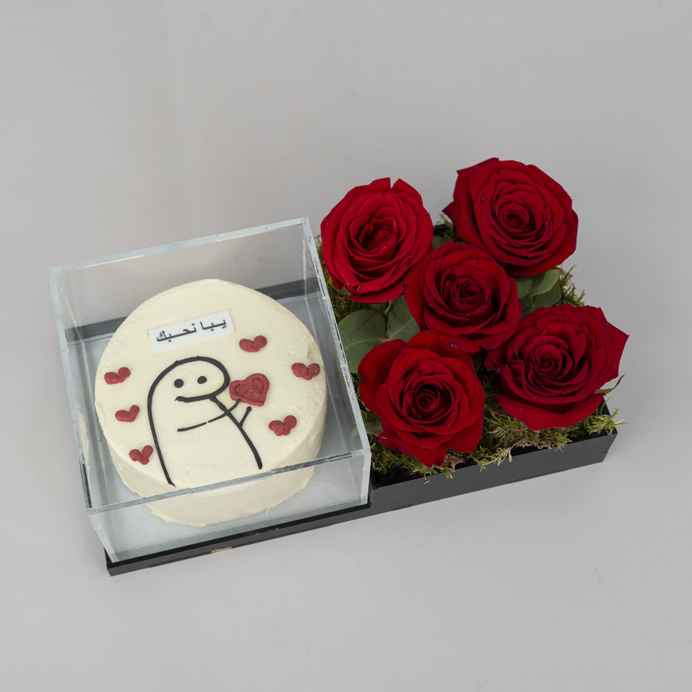 حامل أكريليك مزين بالورود يحتوي على كيكة الشوكولاتة.