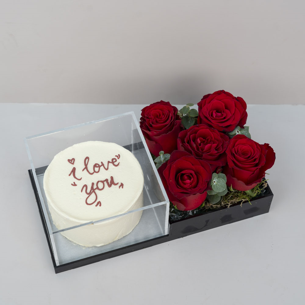 كيكه لانش بوكس لذيذة بنكهه الشوكولاتة بحجم 4 بوصات لشخصين مع 5 حبات من الجوري في بوكس اكريلك.
