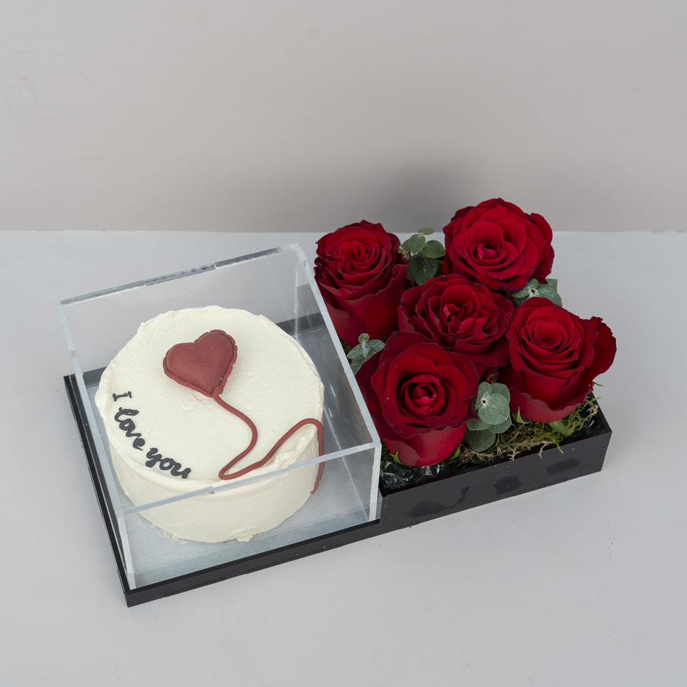 كيكه لانش بوكس لذيذة بنكهه الشوكولاتة بحجم 4 بوصات لشخصين مع 5 حبات من الجوري في بوكس اكريلك.