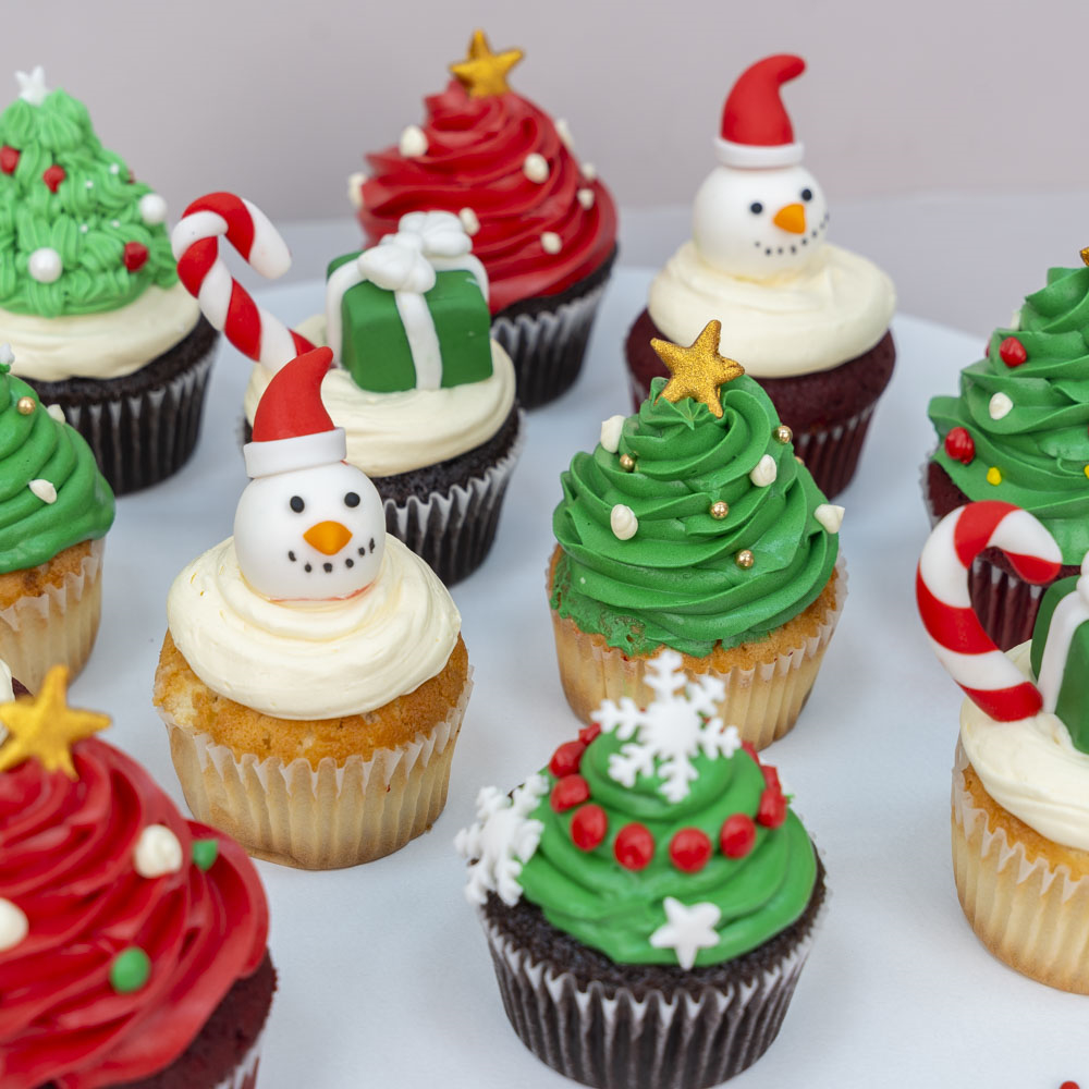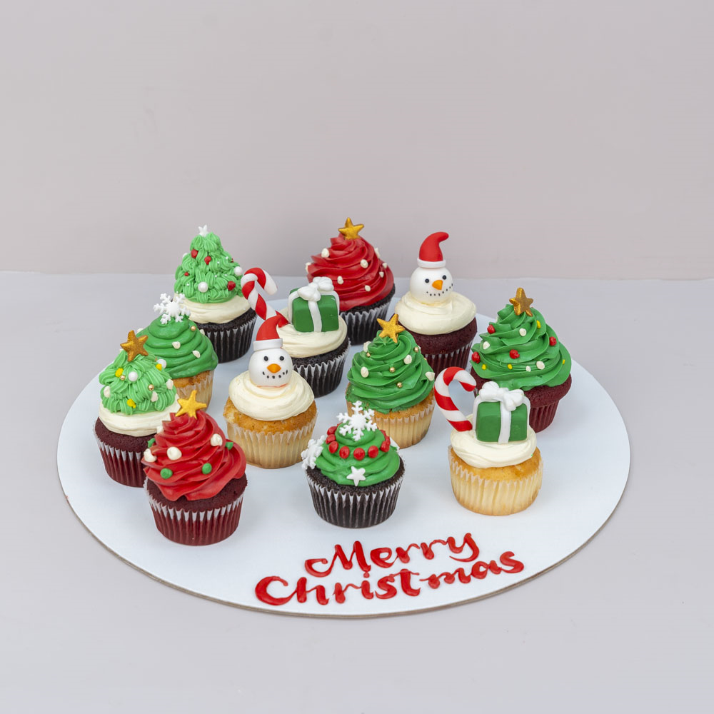 12 قطعة من الكب كيك بنكهات مختلفة، الشوكولاتة والفانيليا والريد فيلفيت.