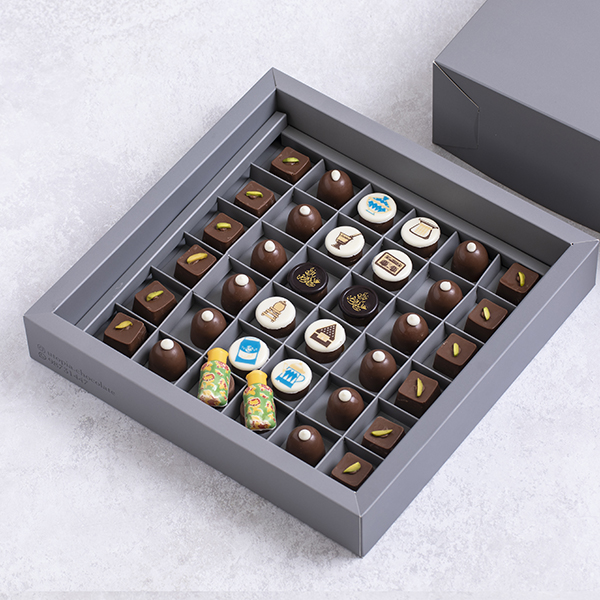 ستة وثلاثون قطعة من الشوكولاتة باربع نكهات مختلفة (بستاشيو- كراميل - نوتيلا- كرنشي) باشكال رمضانيه منوعه.