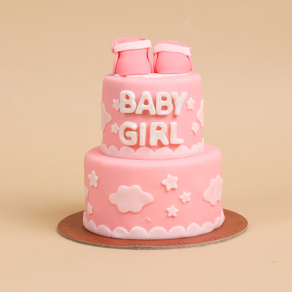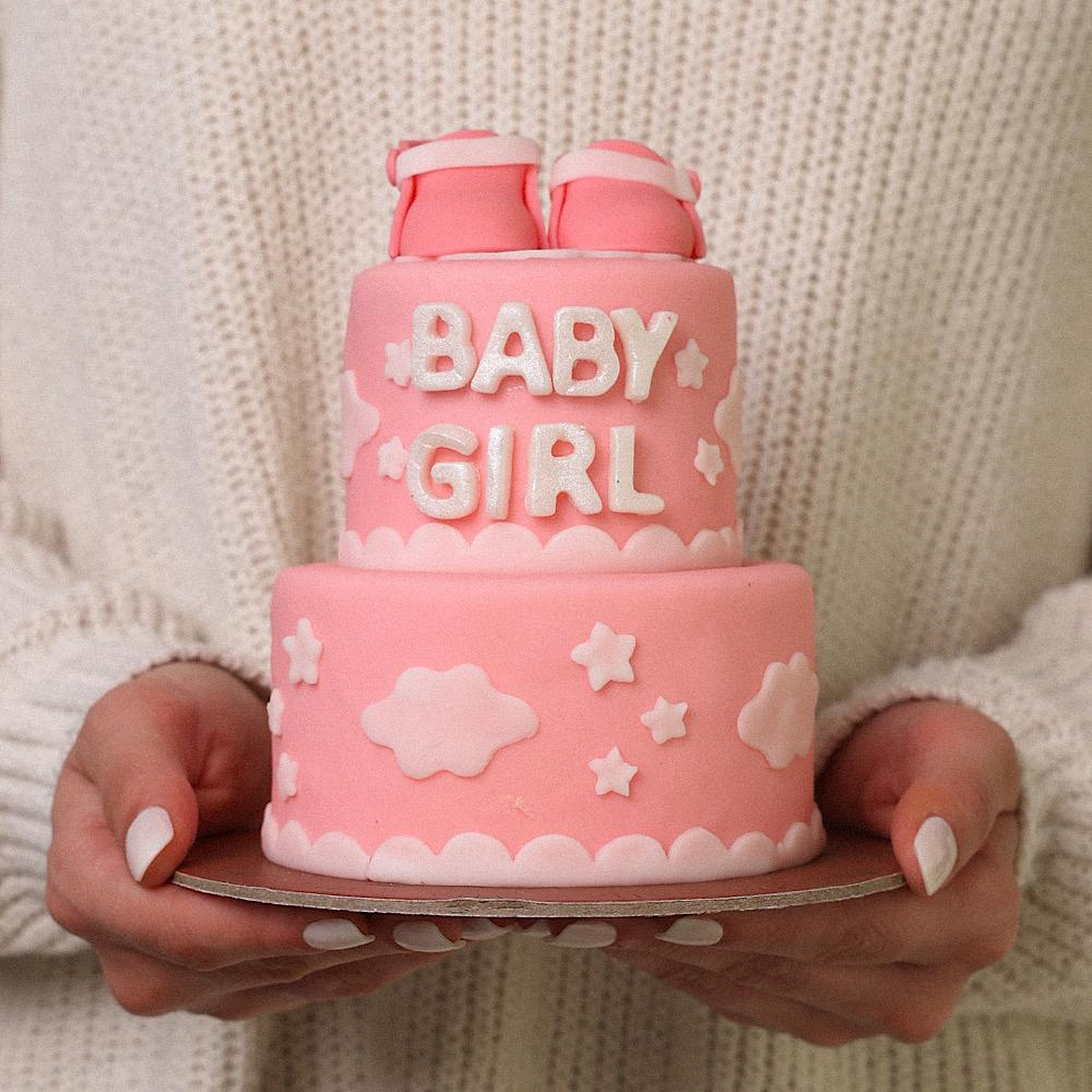 صندوق يحتوي على كيكة باللون الوردي.