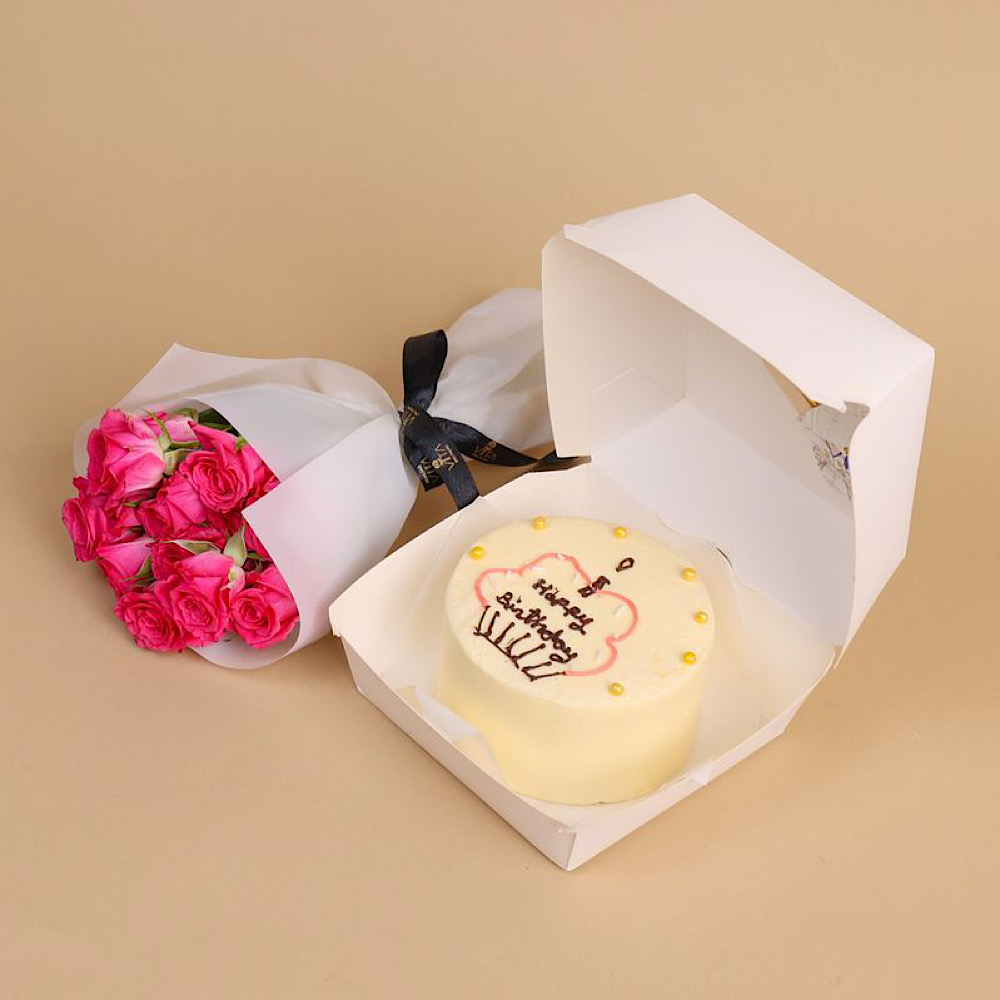 كيكة بينتو ميني بنكهة الفانيلا مع باقة ميني من أزهار البيبي روز.
