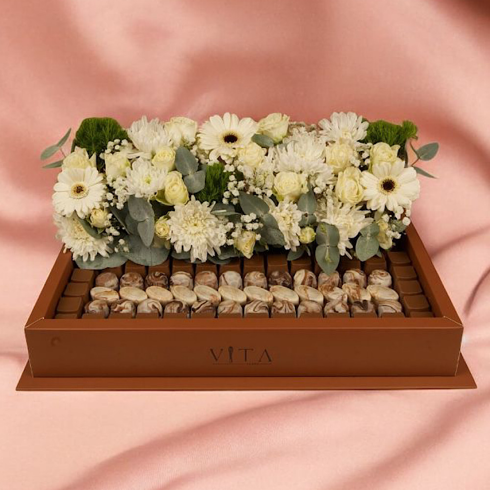 صندوق يحتوي على 1 كيلو شوكولاتة مع انواع مختلفة من الزهور الجربيرا والبيبي جوري والورق الاخضر.