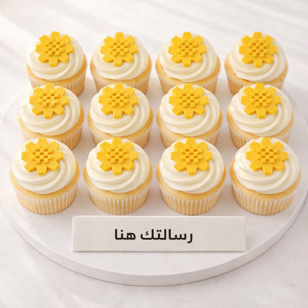 12 قطعة من كب كيك الفانيلا مزينة بشعار زهرة العرفج، مع رسالة من إختيارك.