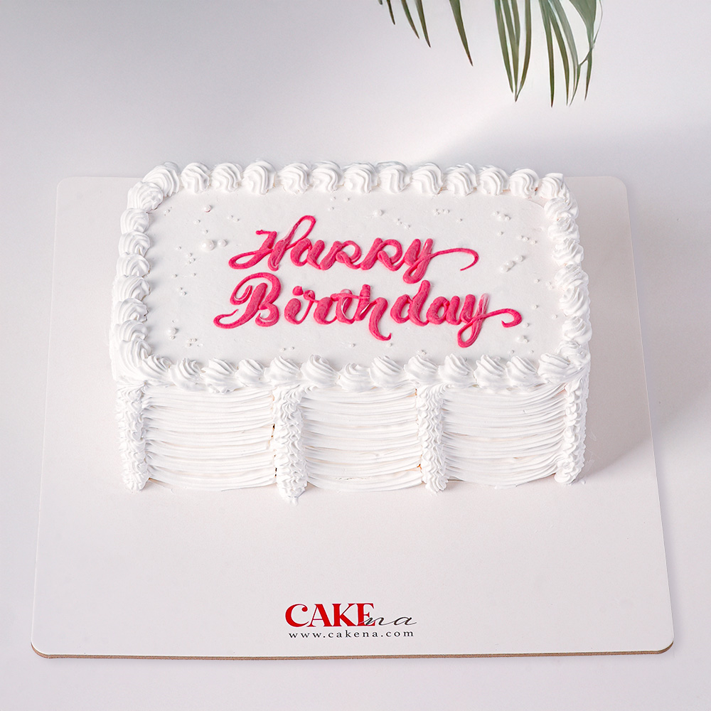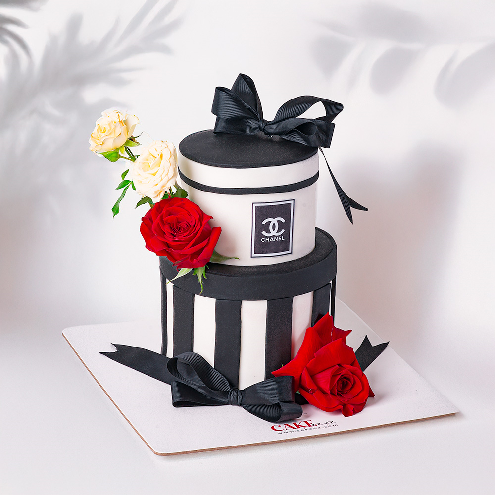 كيكة مكونة من طبقتين مغطاة بفوندان عاجي ومزينة بفيونكة بنية أنيقة ومتوفرة بنكهات شوكولاتة أو فانيلا أو رد فلفت عند الطلب.