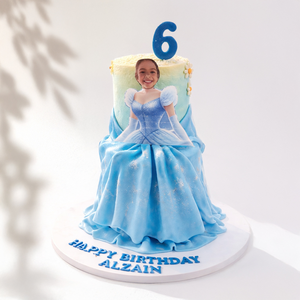 كيكة بطبقتين (6 و4 إنش) بتصميم مستوحى من إلسا مع صورة الطفلة، تكفي من 8 إلى 12 شخص. تصميم مميز يجمع بين شخصية فروزن ولمسة شخصية تخلي الاحتفال أكثر خصوصية.