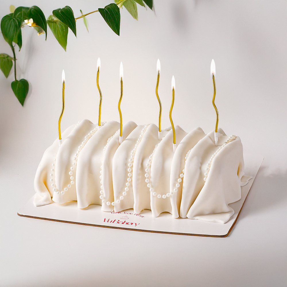كيكة الفوندان باللون الأبيض اللؤلؤي بتصميم مطوي أنيق يشبه القماش، مزينة بلمسات مستوحاة من اللؤلؤ تضيف طابعًا راقيًا وفخمًا، مع شموع ذهبية منحنية تزيدها تميّزًا وأناقة.