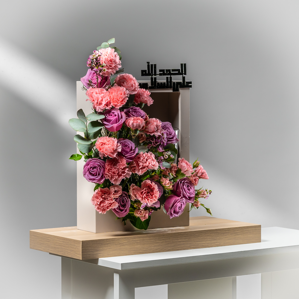 ستاند خشبي مرتب بشكل جميل بزهور الجوري والكارنيشن مع الشوكولاتة.