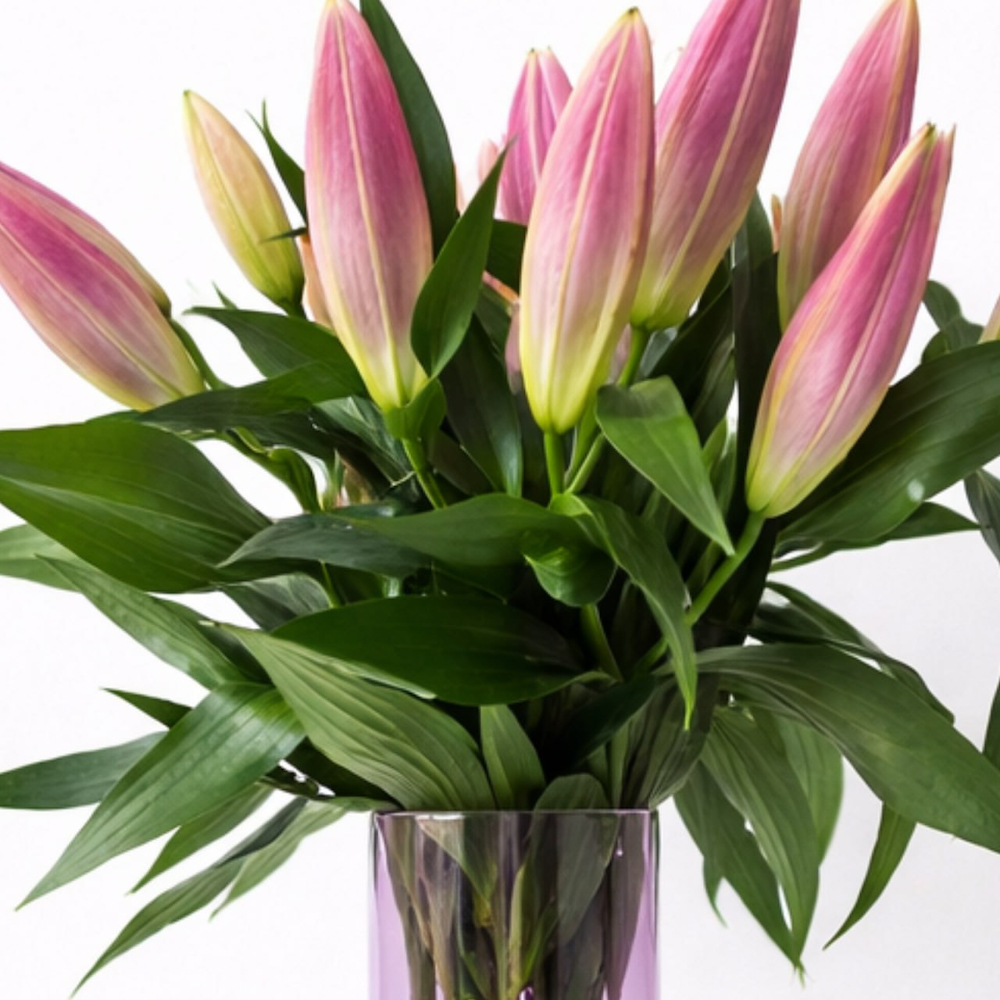 فازة من زهور الليلي الطبيعية، مرتبة بشكل جميل.