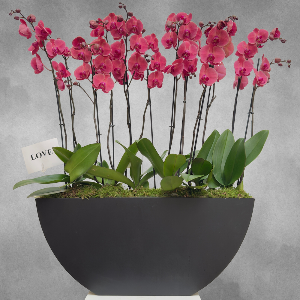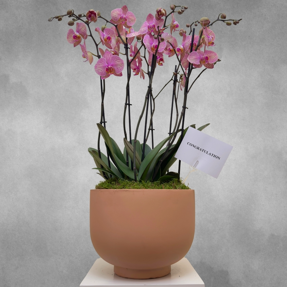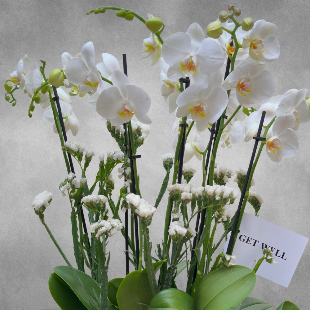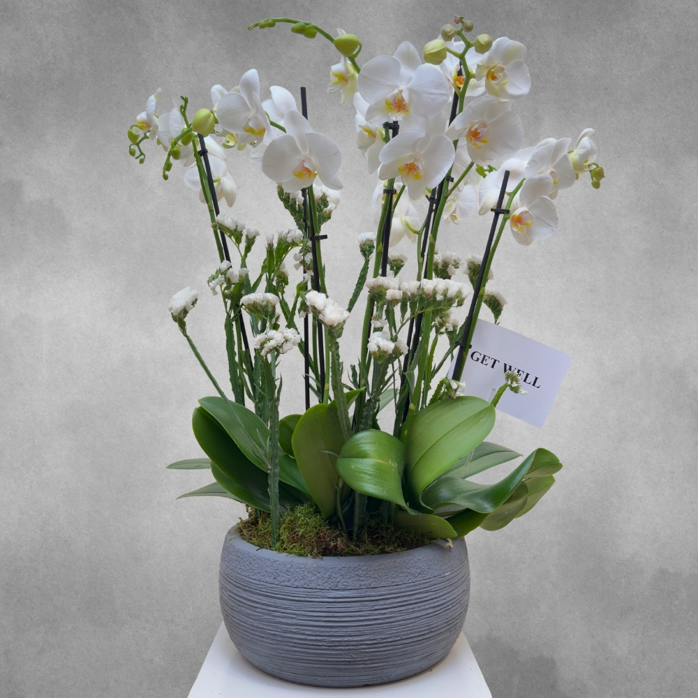 نباتات الأوركيد البيضاء المملوءة في وعاء رمادي مع ستاتيس أبيض.