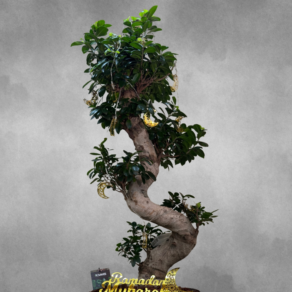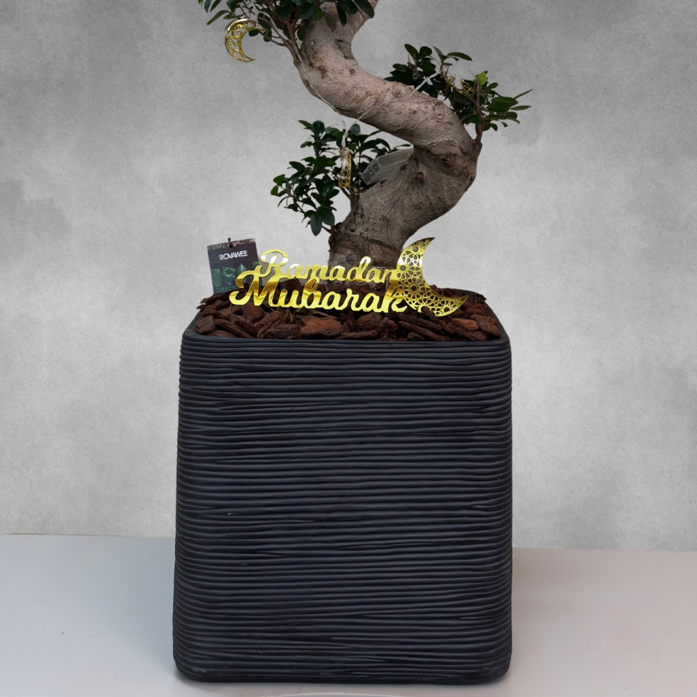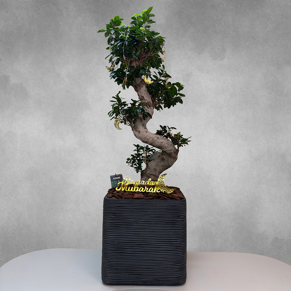 بلانتر أنيق مليئ بشجرة البونساي بتصميم (S). عرض عصري وأنيق مثالي لإضافة لمسة من الخضرة والرقي إلى أي مكان.
