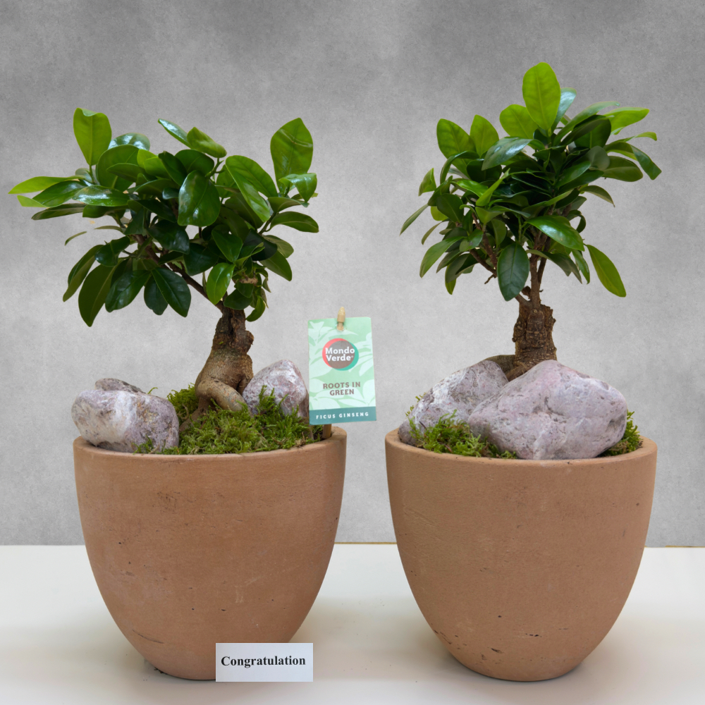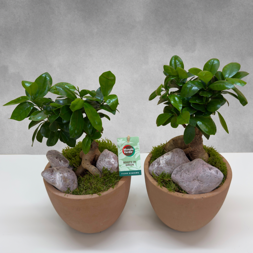 مجموعة من نبتتين فيكوس جينسينغ بونساي، مرتبة في أوعية بلون البيج من السيراميك.