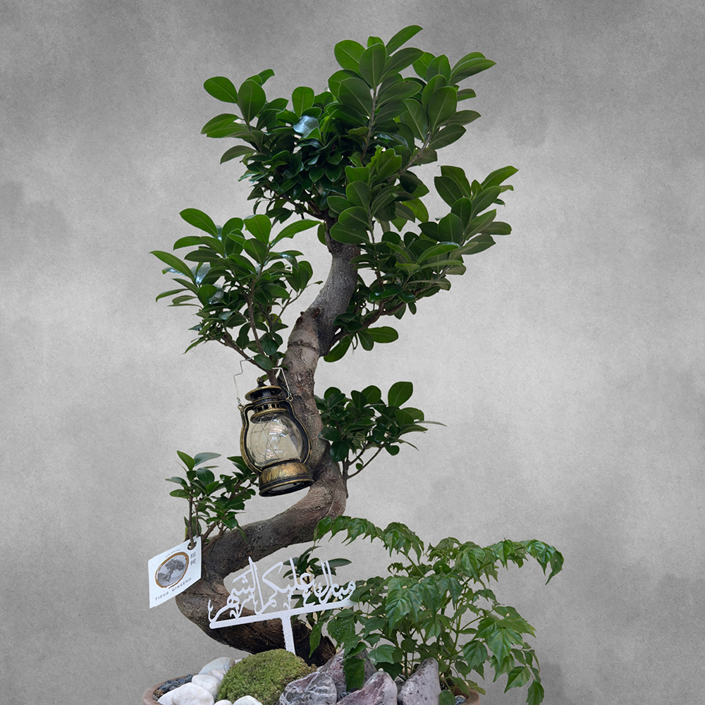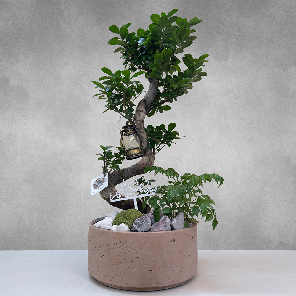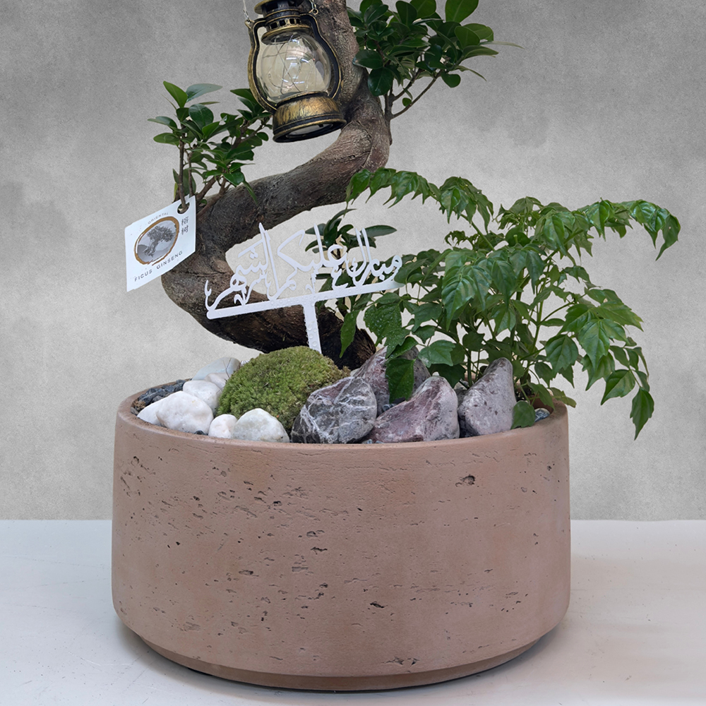 نبتة فيكس جينسنغ، مرتبة بشكل جميل في وعاء طيني بيج اللون من السيراميك، مما يخلق عرض أنيق وطبيعي.