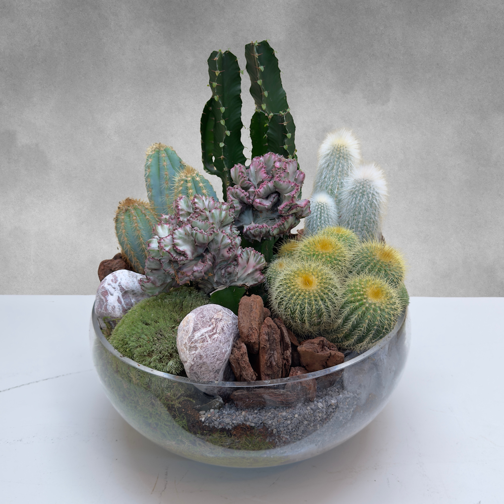 صبار الفربيون اللبني، باروديا واراسي وصبار بيلوسيريوس أزيروس، مرتبة في فازة زجاجية.