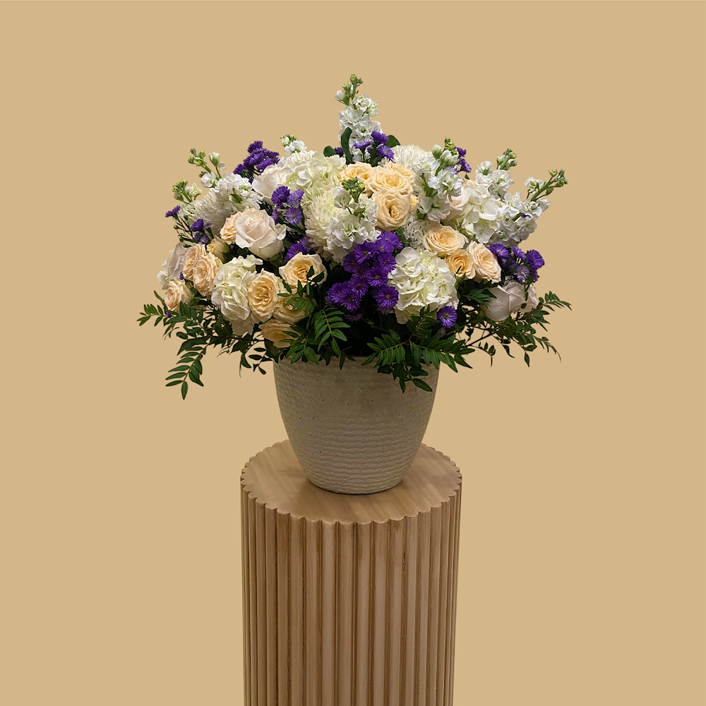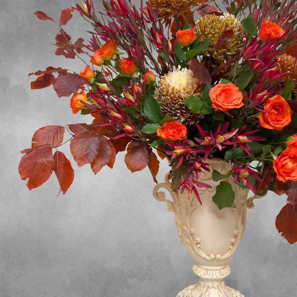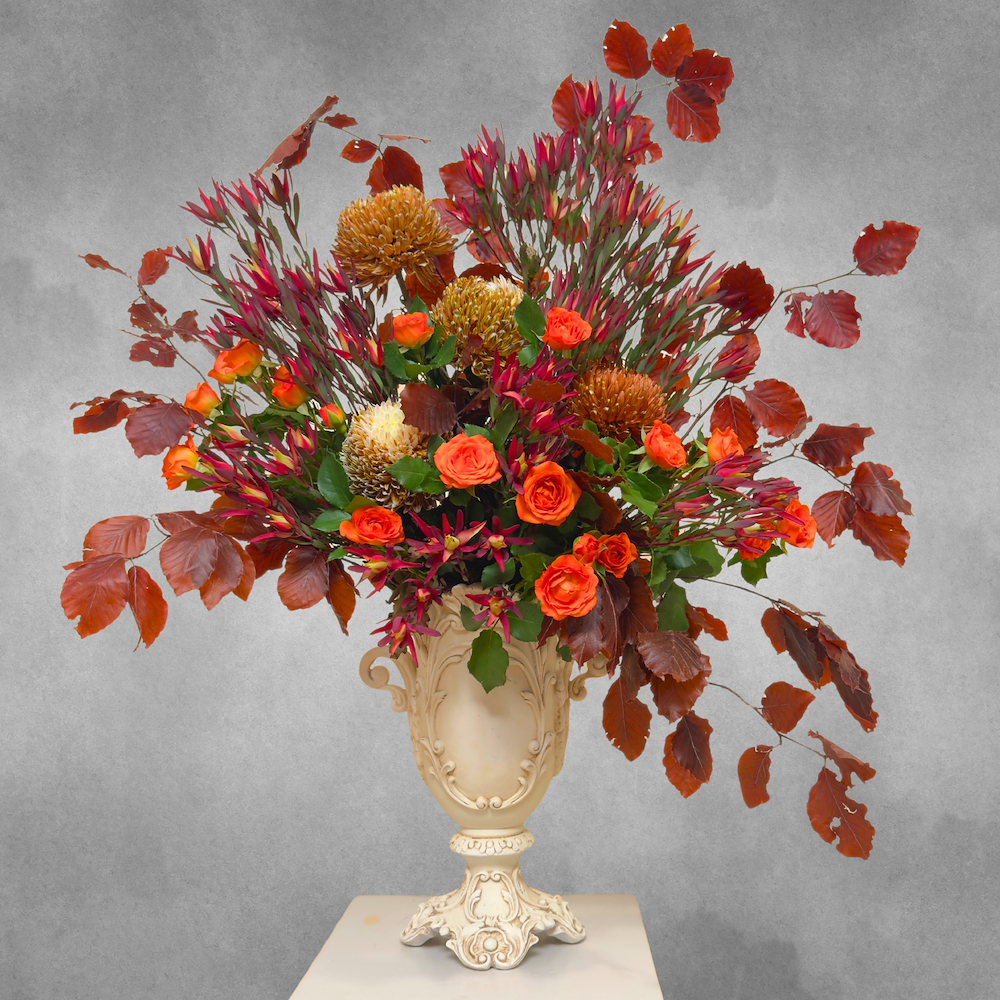 فازة مليئة بأزهار البيبي روز وأوراق السفاري الجميلة باللون الأحمر.